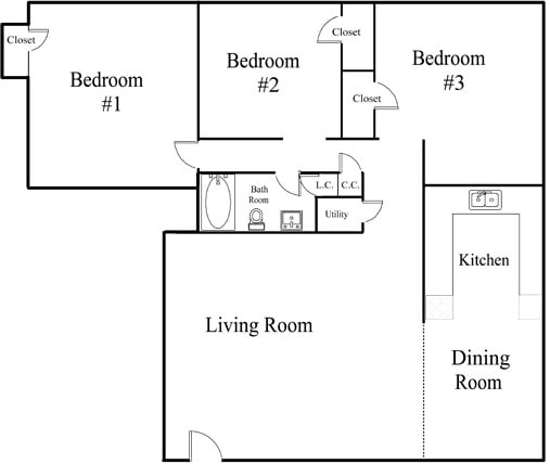 Apartment Model: 2 BR LG$1,0502 Bedroom, 1 Bath, 890-900 sq ftUnavailable2 BR LG - Floorplan 1 3 Bedrooms