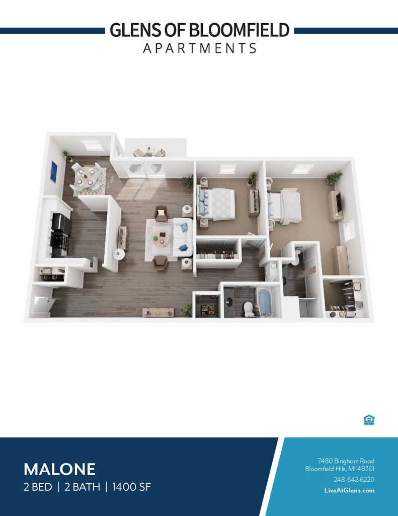 Welcome home to Glens of Bloomfield. Experience the perfect blend of comfort and convenience at The Glens of Bloomfield located in the heart of Bloomfield Hills, MI. Our spacious two-bedroom apartment homes feature modern finishes, open-concept layouts, and some offer private balconies or patios. Enjoy our amenities, including a swimming pool, 24-hour fitness center, and pet-friendly spaces designed for you and your furry friends.