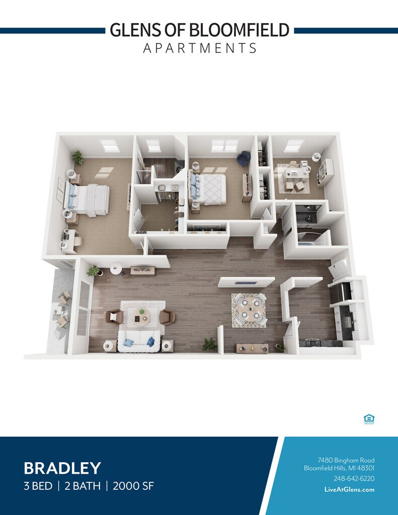 Apartment Model: 3 Bed 2 BathFrom $2,2803 Bedroom, 2 Bath, 2000 sq ftAvailable Now![]()