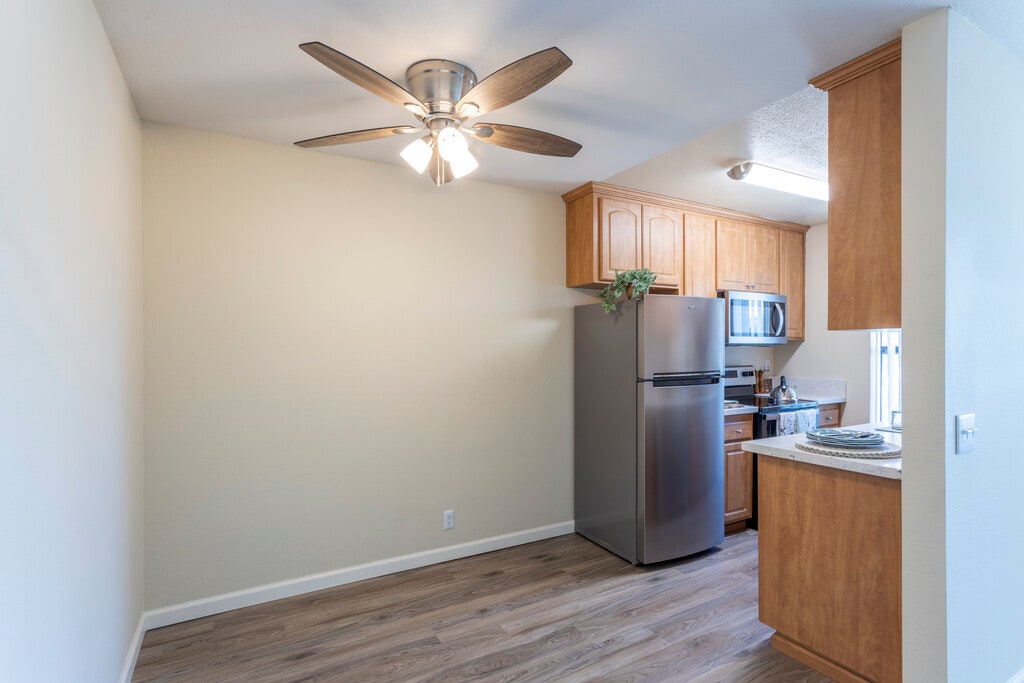 Apartment Features: *Two FREE assigned parking spaces *Remodeled kitchen with beautiful cabinets, countertops, and appliances *Vinyl plank flooring in kitchen and dining areas *Carpet in living room and bedrooms *Central A/C and heating *Oversize Private Patio *Brand new double-pane windows for energy efficiency and noise reduction *All major kitchen appliances in stainless steel
