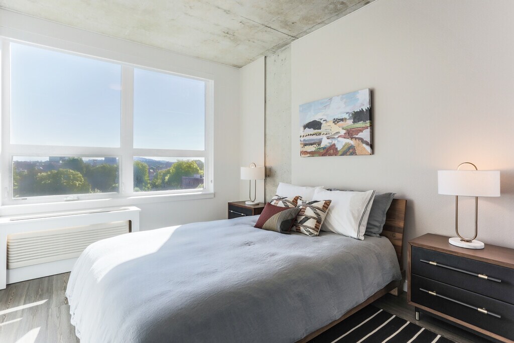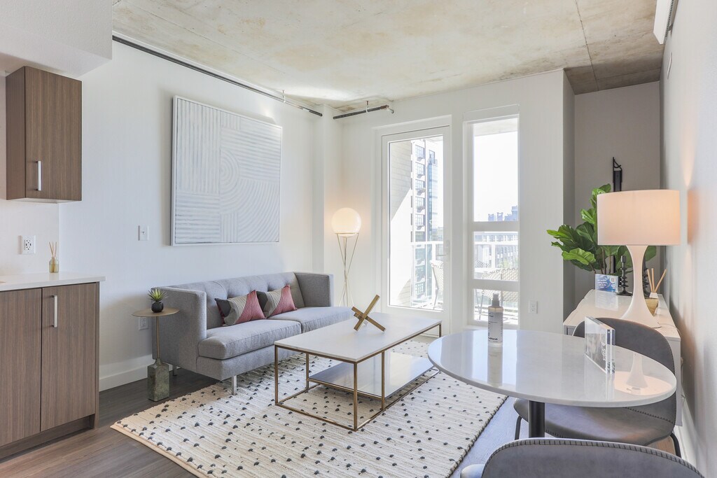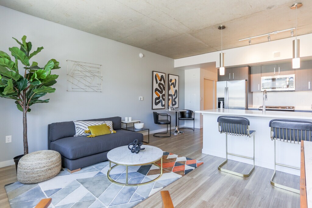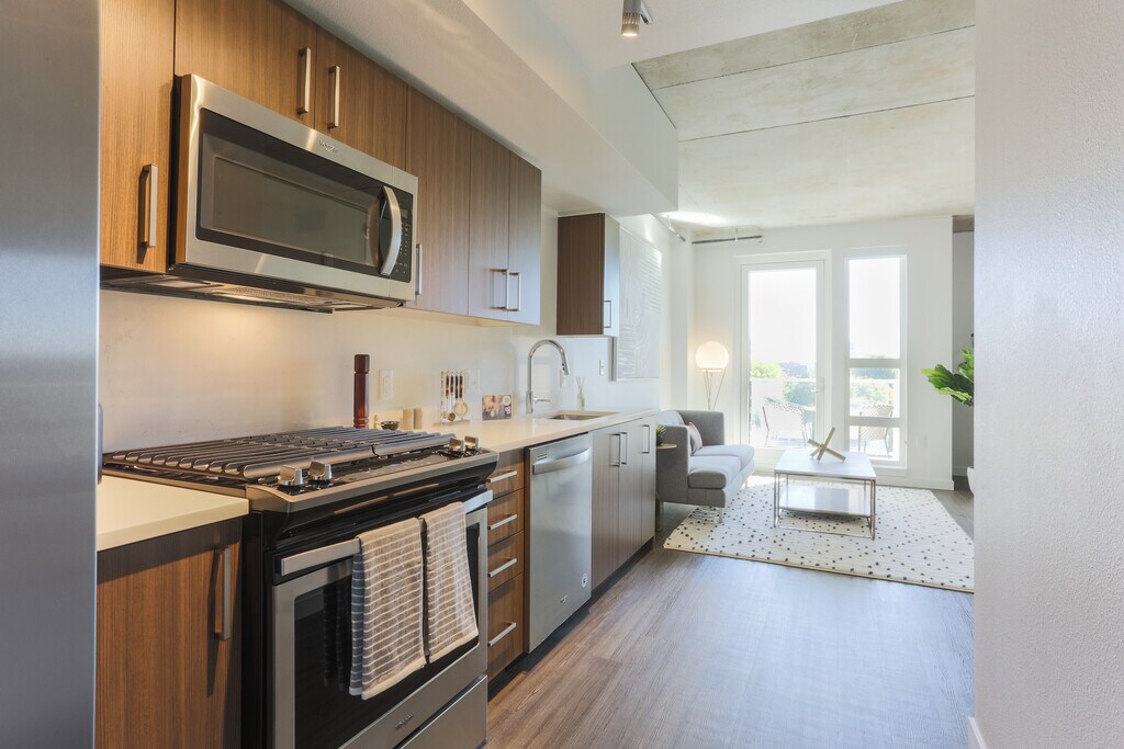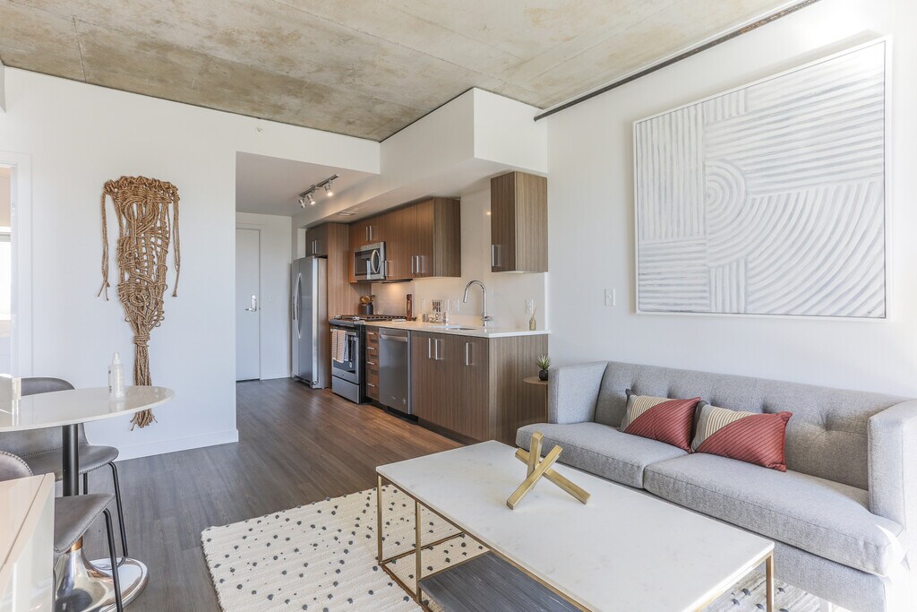 Airy open layouts, oversized windows, light filled spaces, an industrial vibe, and a view. Its all designed to feel as good as it looks. Modern kitchen with quartz countertops, stainless steel appliances, designer fixtures and large under-mount stainless steel sinks. Primary bathrooms equipped with rainfall showerheads and illuminated vanity mirrors. Bike storage, temperature control, and front-load washers and dryers. The must-haves, the nice-to-haves, the dream amenitiestheyre all included to help you live better.