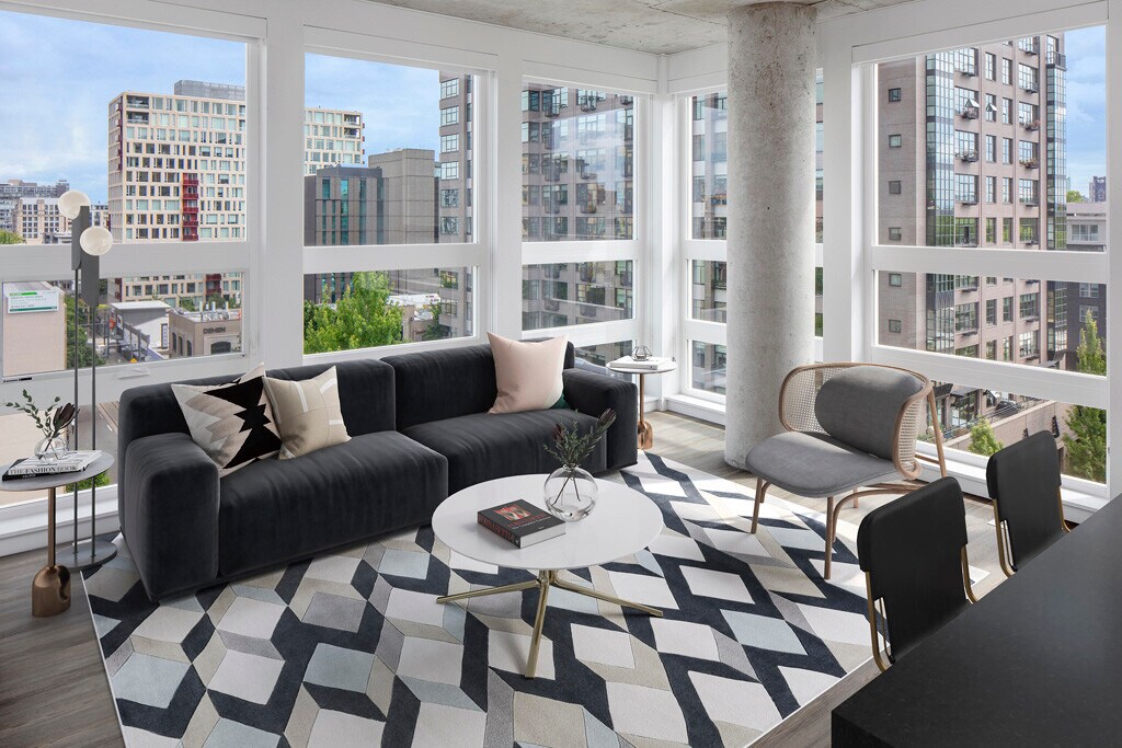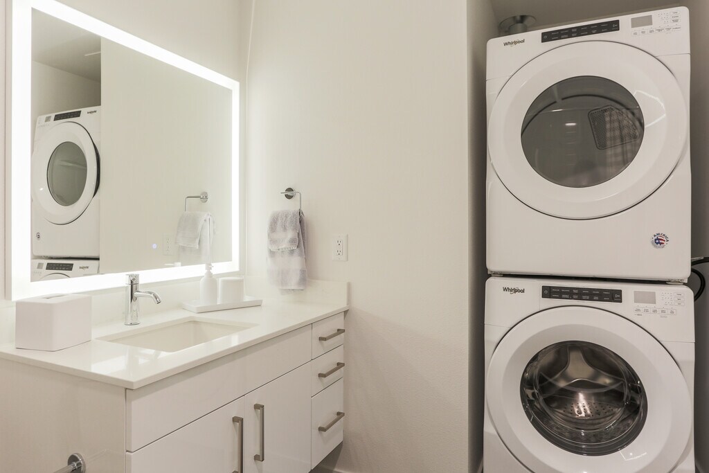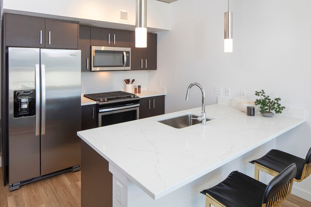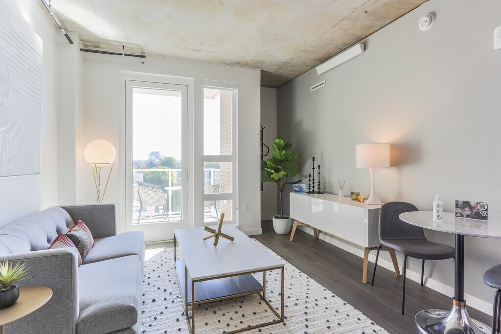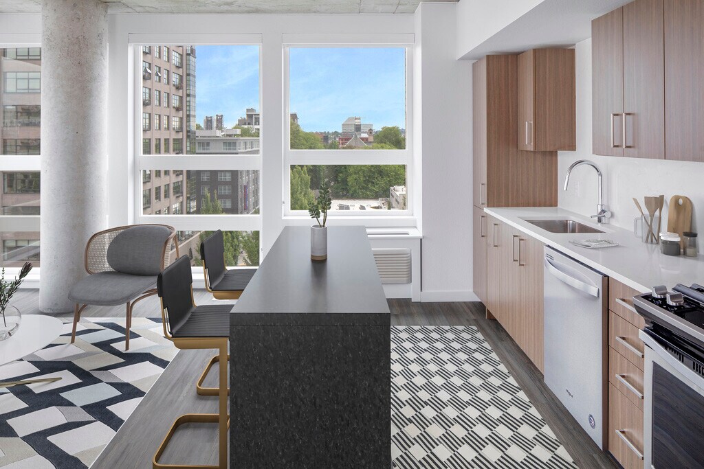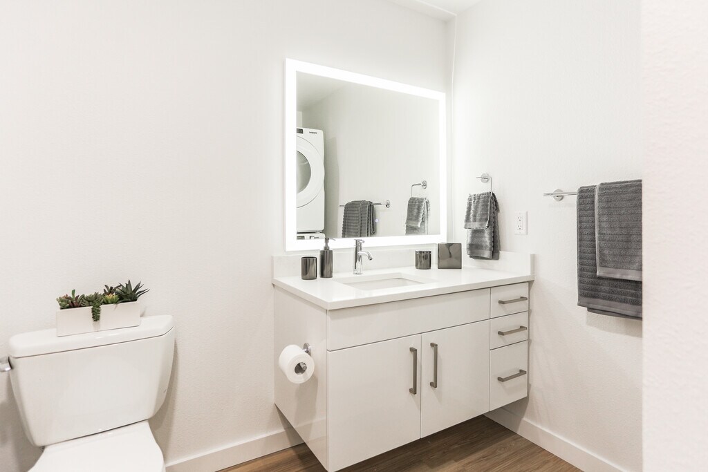 Airy open layouts, oversized windows, light filled spaces, an industrial vibe, and a view. Its all designed to feel as good as it looks. Modern kitchen with quartz countertops, stainless steel appliances, designer fixtures and large under-mount stainless steel sinks. Primary bathrooms equipped with rainfall showerheads and illuminated vanity mirrors. Bike storage, temperature control, and front-load washers and dryers. The must-haves, the nice-to-haves, the dream amenitiestheyre all included to help you live better.