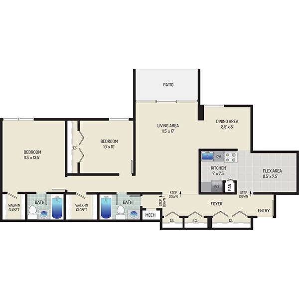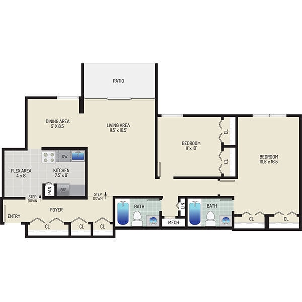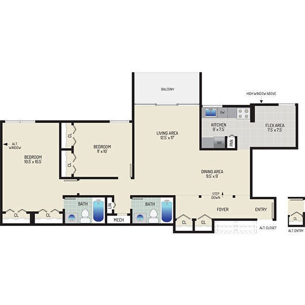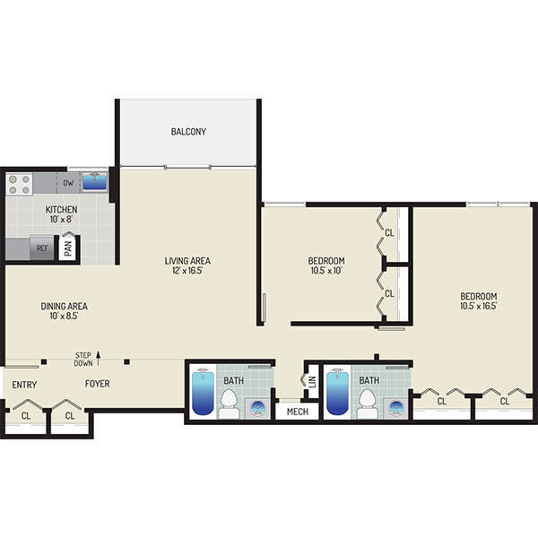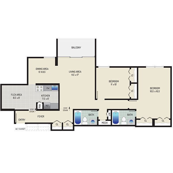 2 Beds, 2 Baths, 1075 sq ftAvailable NowLargest 2 BedroomThis is the largest 2 Bedroom at this PropertyModel Gallery
