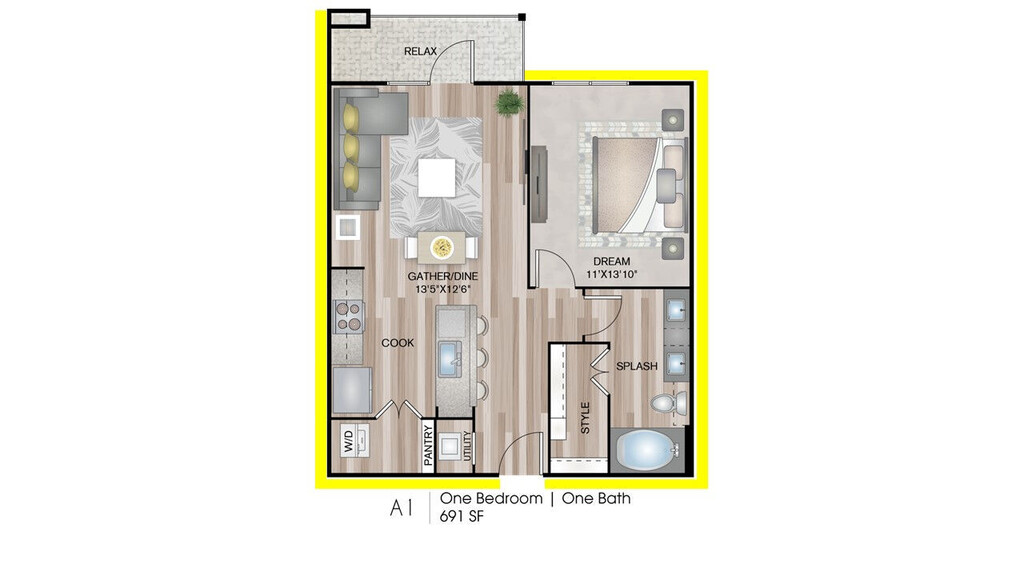 Apartment Model: A1From $1,3991 Bedroom, 1 Bath, 691 sq ftAvailable NowFloor plans are artist's rendering. All dimensions are approximate. Actual product and specifications may vary in dimension or detail. Not all features are available in every rental home. Prices and availability are subject to change. Base rent is based on monthly frequency. Additional fees may apply, such as but not limited to package delivery, trash, water, amenities, etc. Deposits vary. Please see a representative for details.