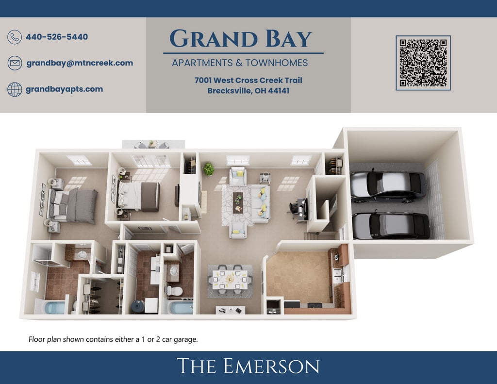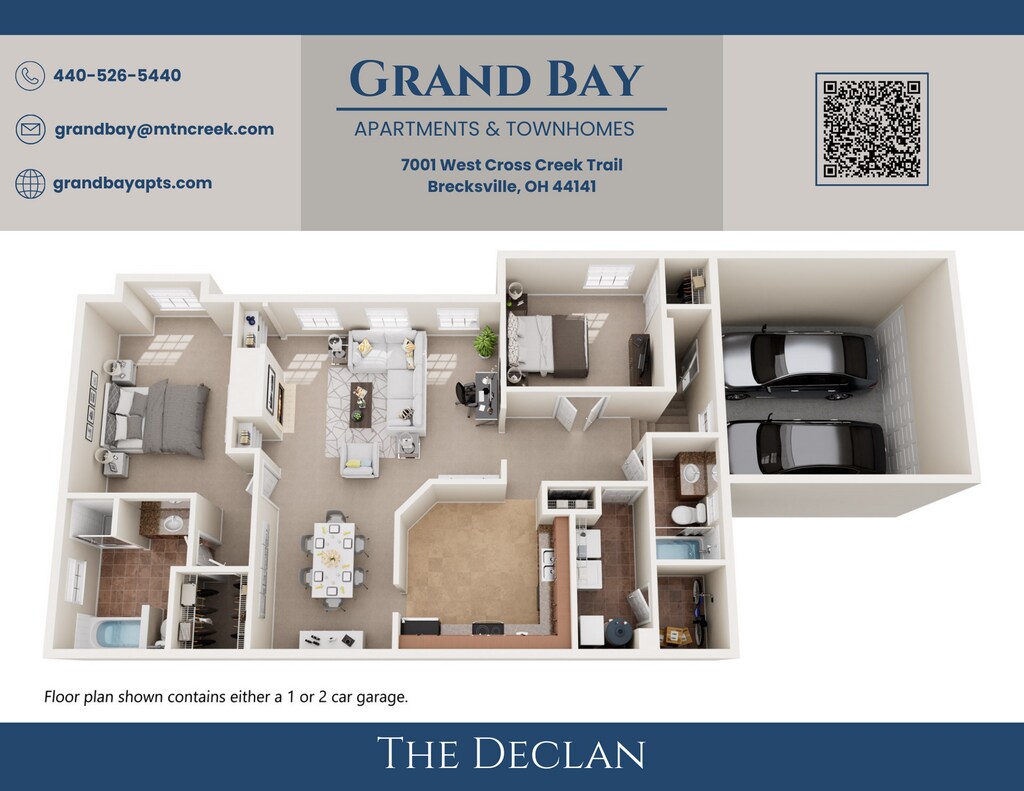 Experience luxury living at Grand Bay Apartments & Townhomes! Our spacious 2-bedroom and 3-bedroom apartment homes offer exceptional square footage for ultimate comfort. Enjoy a fully equipped eat-in kitchen with granite counters, plus an elegant dining room ideal for entertaining. Each apartment home features a cozy gas log fireplace, creating the perfect ambiance for relaxation. Retreat to generously sized bedrooms, including a master suite with a full bath and walk-in closet. With an in-suite washer and dryer, laundry is a breeze, and you’ll appreciate your own attached garage. Welcome home to unparalleled comfort and style!