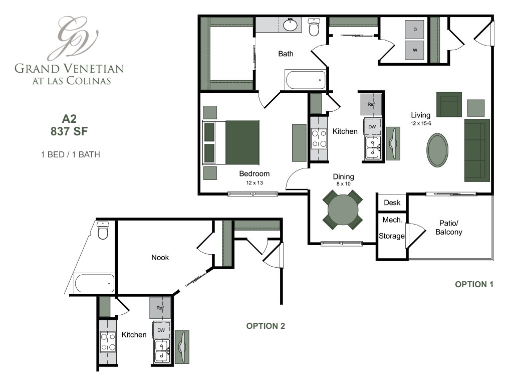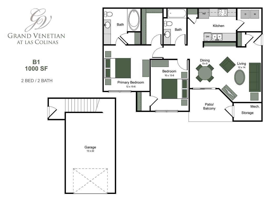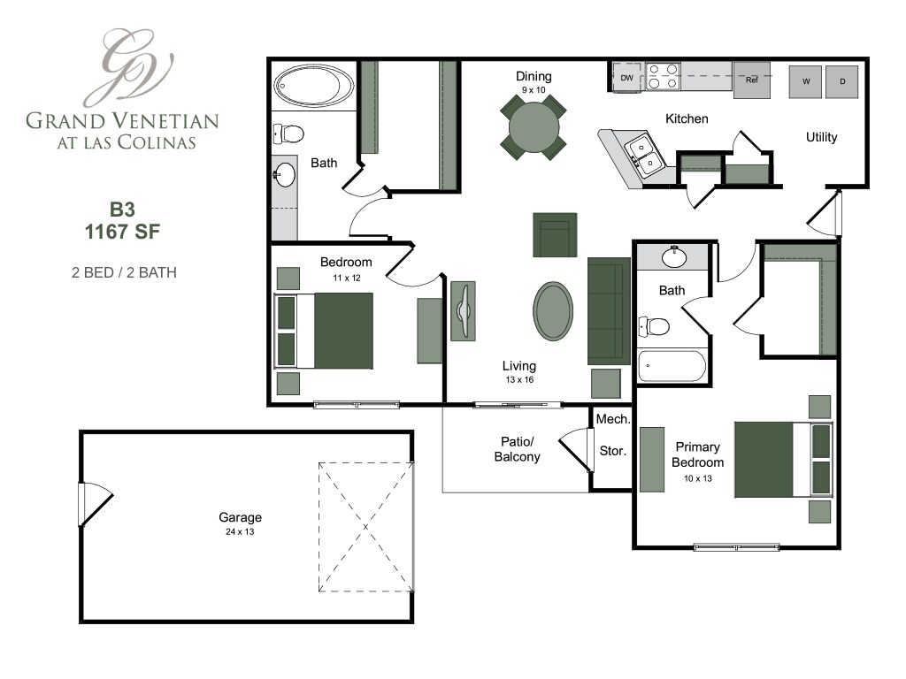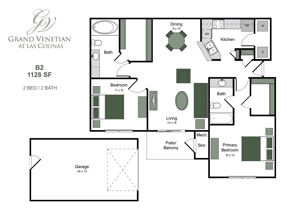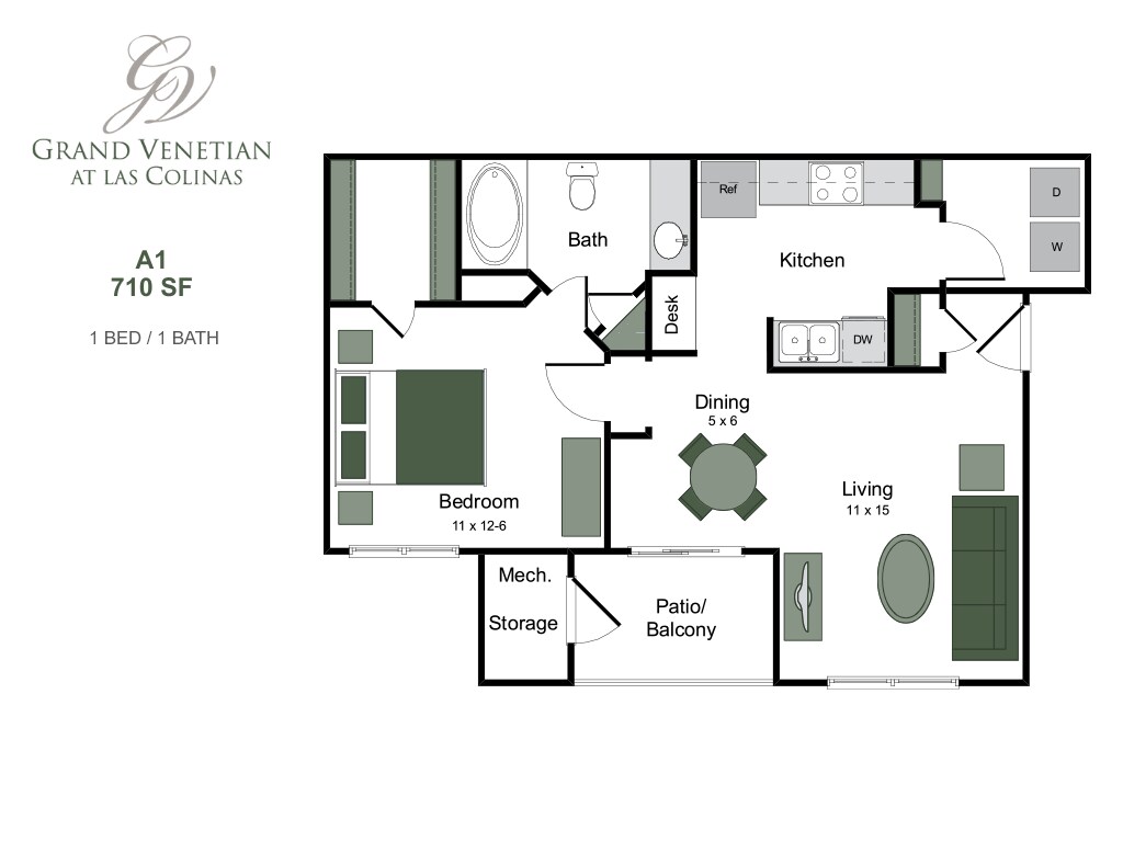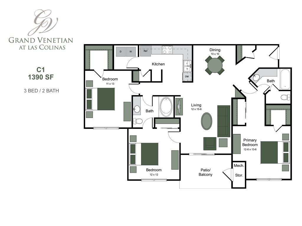 Grand Venetian at Las Colinas offers 1 to 3 Bedroom apartments starting from $1,147 and having 710–1,390 sq ft. Here is the current pricing and availability: