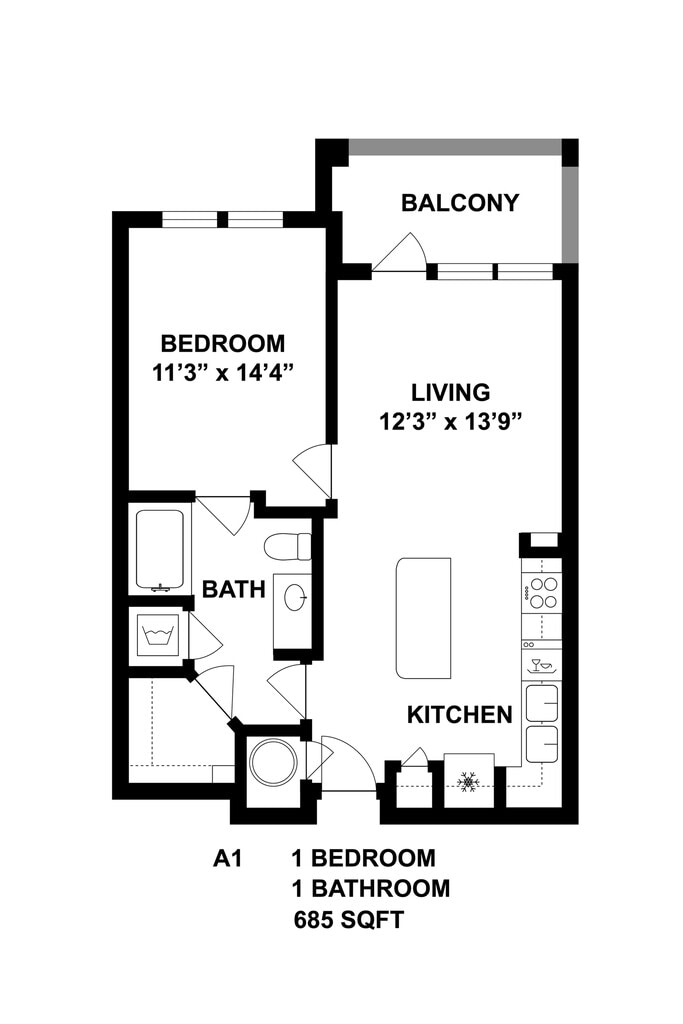 A1 - Floorplan 2 Apartment Unit: 3-206Apartment Model: A1From $1,7331 Bedroom, 1 Bath, 685 sq ftAvailable December 31, 2025Floorplan A4