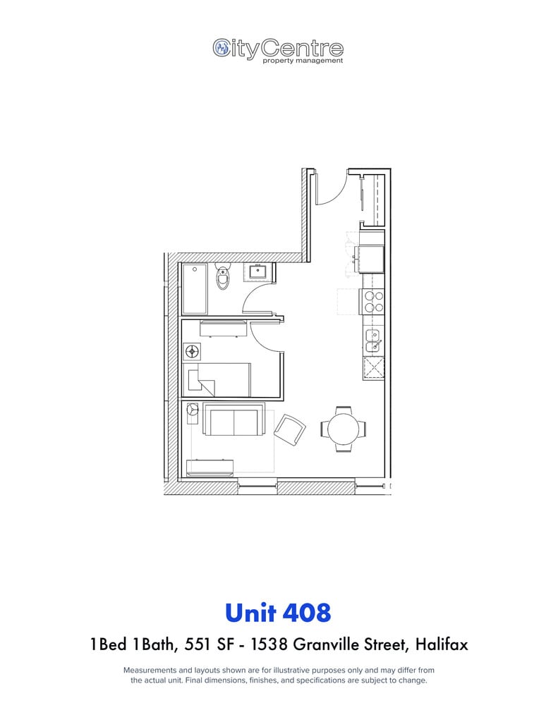 Apartment Unit: 408Apartment Model: BachelorStudio, 1 Bath, 551 sq ftAvailable November 1, 2025Unit: 408 - Floorplan 1 Studio, 1 bath