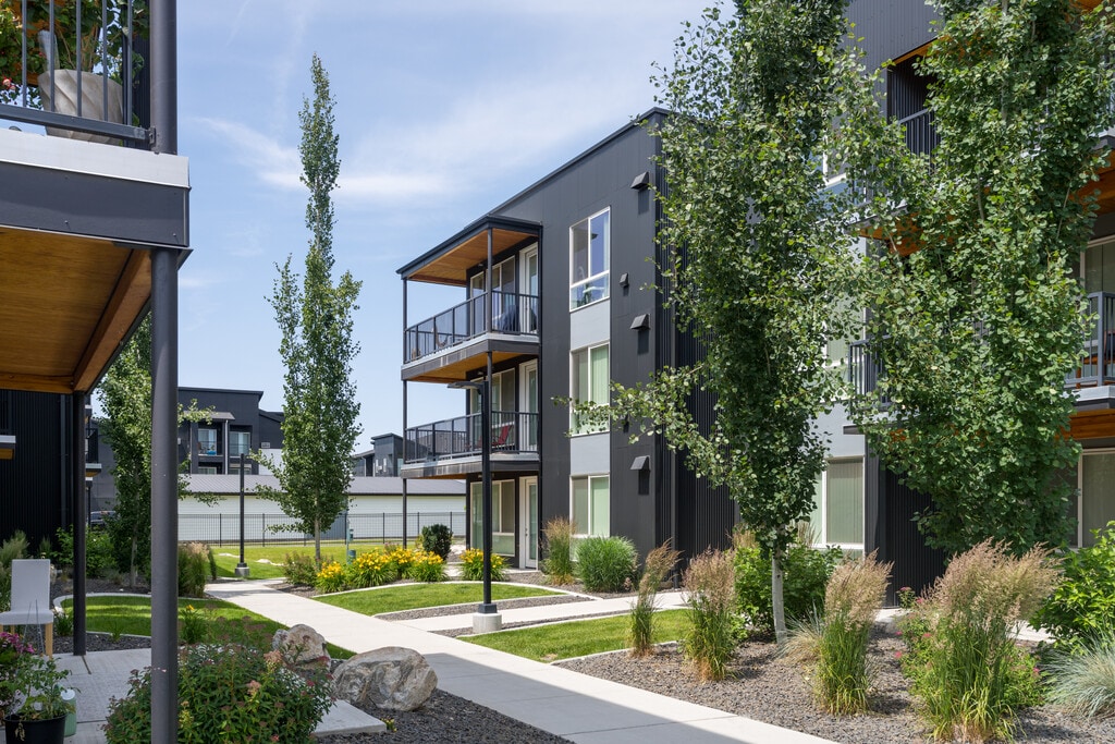 Discover a fresh take on modern living at Green Door Flats, where striking carbon black siding and sleek flat-roof architecture meet a vibrant community atmosphere in the heart of Spokane Valley. These thoughtfully designed homes offer a sophisticated lifestyle defined by high-end finishes, including floor-to-ceiling windows that flood every room with natural light, elegant quartz countertops, and premium stainless steel GE appliances. Whether you are relaxing in a spa-inspired bathroom with an extendable vanity mirror or retreating to a master suite specifically sized for a king-sized bed, every detail has been meticulously crafted for your comfort. Residents enjoy an array of premium amenities such as a 24-hour fitness center featuring glass garage doors, a professional conference room for remote work, and a community lounge with complimentary Wi-Fi. Step outside to explore beautifully landscaped grounds that include a shared community garden, cozy fire pits, and professional grills perfect for weekend gatherings. Your pets are welcome here too, with a dedicated fenced dog run and nearby walking trails to enjoy. Strategically situated with easy access to I-90 and centrally located between downtown Spokane and Coeur d'Alene, Green Door Flats places you minutes away from the premier shopping and dining at the Spokane Valley Mall while providing a peaceful sanctuary to call home. Modern essentials like full-sized washers and dryers, luxury plank flooring, and automated package delivery systems ensure that your daily routine is as seamless as it is stylish.