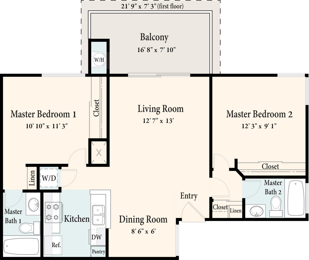 The Valley Way - Upstairs - Floorplan 1 Apartment Unit: 060Apartment Model: The Valley Way - Upstairs$3,1292 Bedroom, 2 Bath, 885 sq ftAvailable NowThe Valley Oak - Upstairs