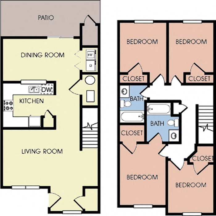 Apartment Model: 4 Bedroom TownhomeFrom $1,8684 Bedroom, 2 Bath, 1358 sq ftAvailable Now![]()