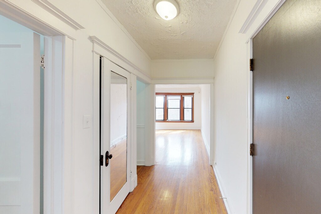 Blending styles from the Prairie School and the Arts and Crafts Movement, this corner building features a warm, red brick facade that moves upward to highlight expansive windows capped off by projected eaves. The extended exterior makes a bold statement, with windows accentuated by creamy limestone trim and ornamental details. Just steps from bustling 53rd Street, the property is centrally located, within minutes of everything in Hyde Park.