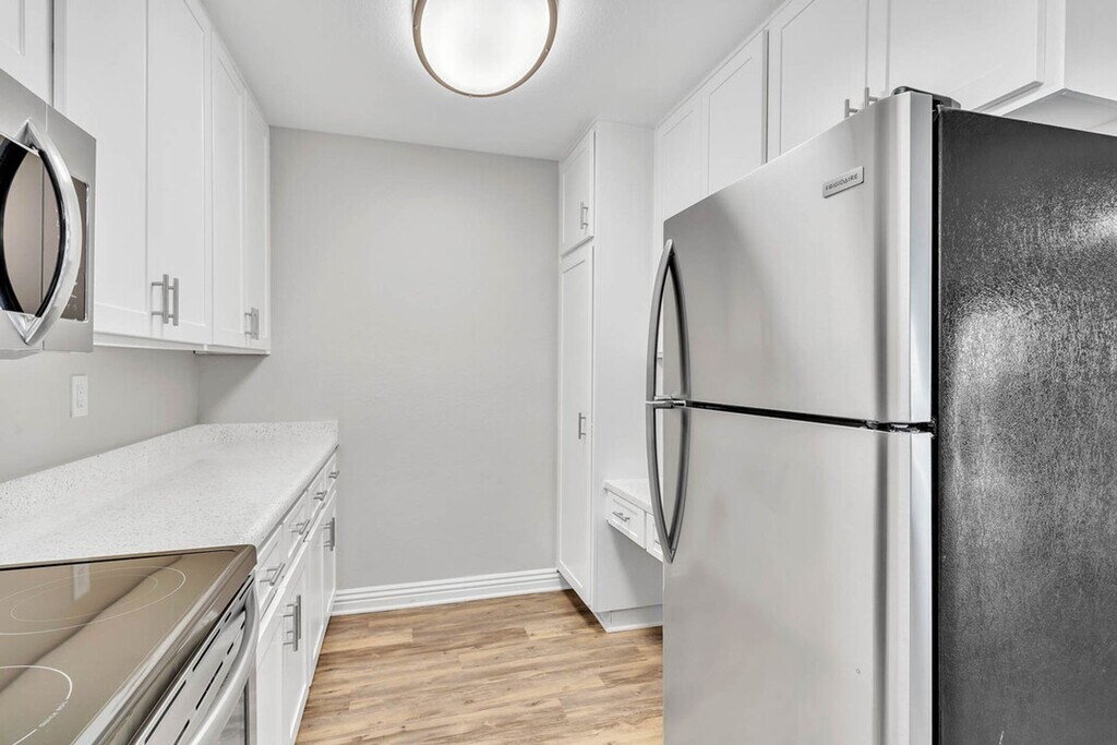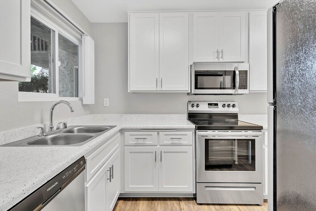 These units are freshly remodeled with modern appointments! All remodeled units include white shaker cabinet doors, new interior doors and hardware, contemporary light fixtures, and designer ceiling fan in the dining / family room. Some units have brand new cabinets with soft-close drawers and quartz countertops for a premium experience.