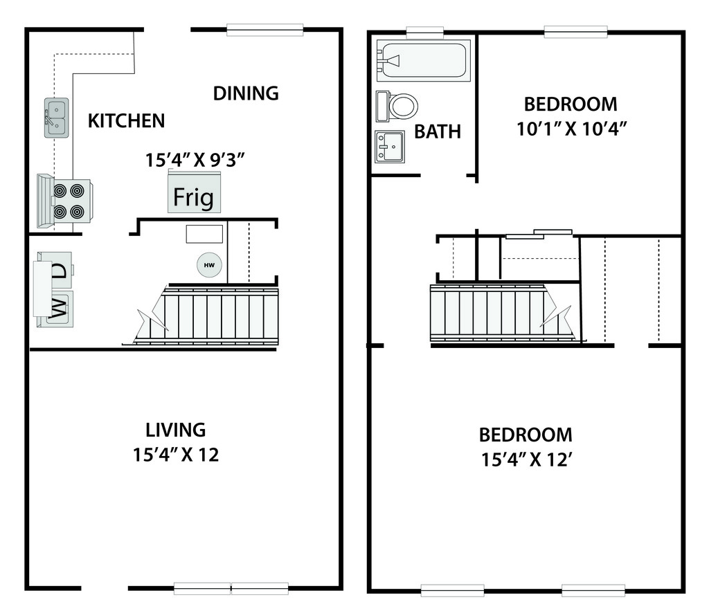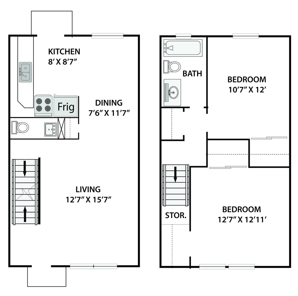 Two Bedroom, 1 Ba Townhome - Floorplan 5 Two Bedroom, 1.5 Bath w/ Basement