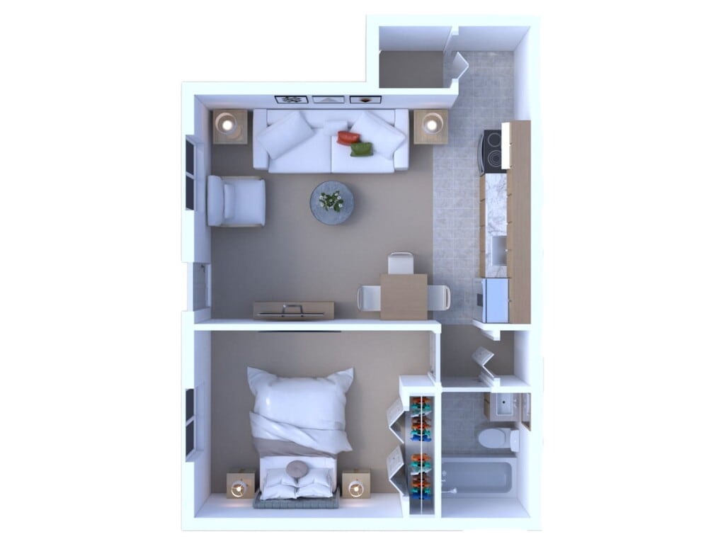 Apartment Model: 1 Bed 1 Bath | RenovatedFrom $1,5151 Bedroom, 1 Bath, 788 sq ftAvailable April 10, 2026Floor plans are artist's rendering. All dimensions are approximate. Actual product and specifications may vary in dimension or detail. Not all features are available in every rental home. Please see a representative for details.