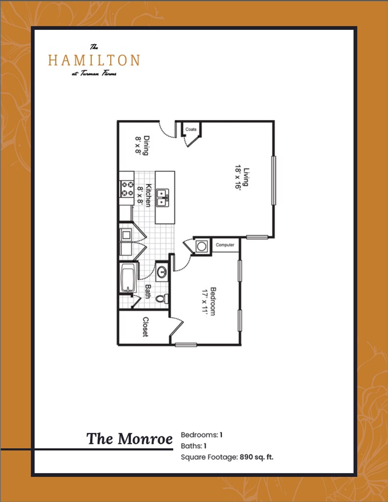 1 Bed, 1 Bath, 890 sq ftAvailable NowLargest 1 BedroomThis is the largest 1 Bedroom at this PropertyModel Gallery