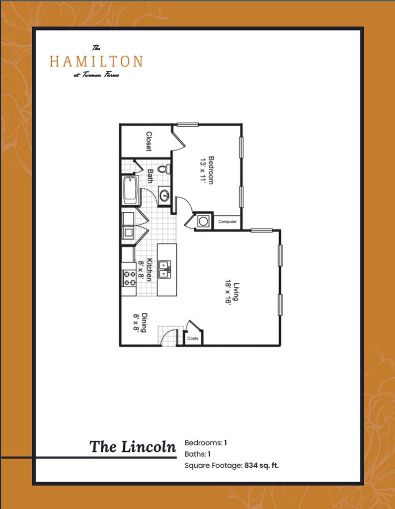 1BD/1B Lincoln Floorplan. Eleanor Renovation, o...