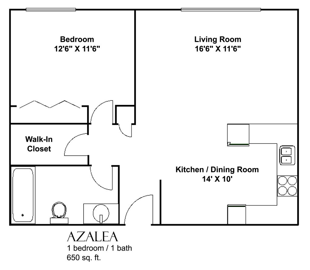 The Azalea - Floorplan 1 Apartment Unit: 4-209Apartment Model: The Azalea$1,3791 Bedroom, 1 Bath, 650 sq ftAvailable January 1, 2026Alderwood