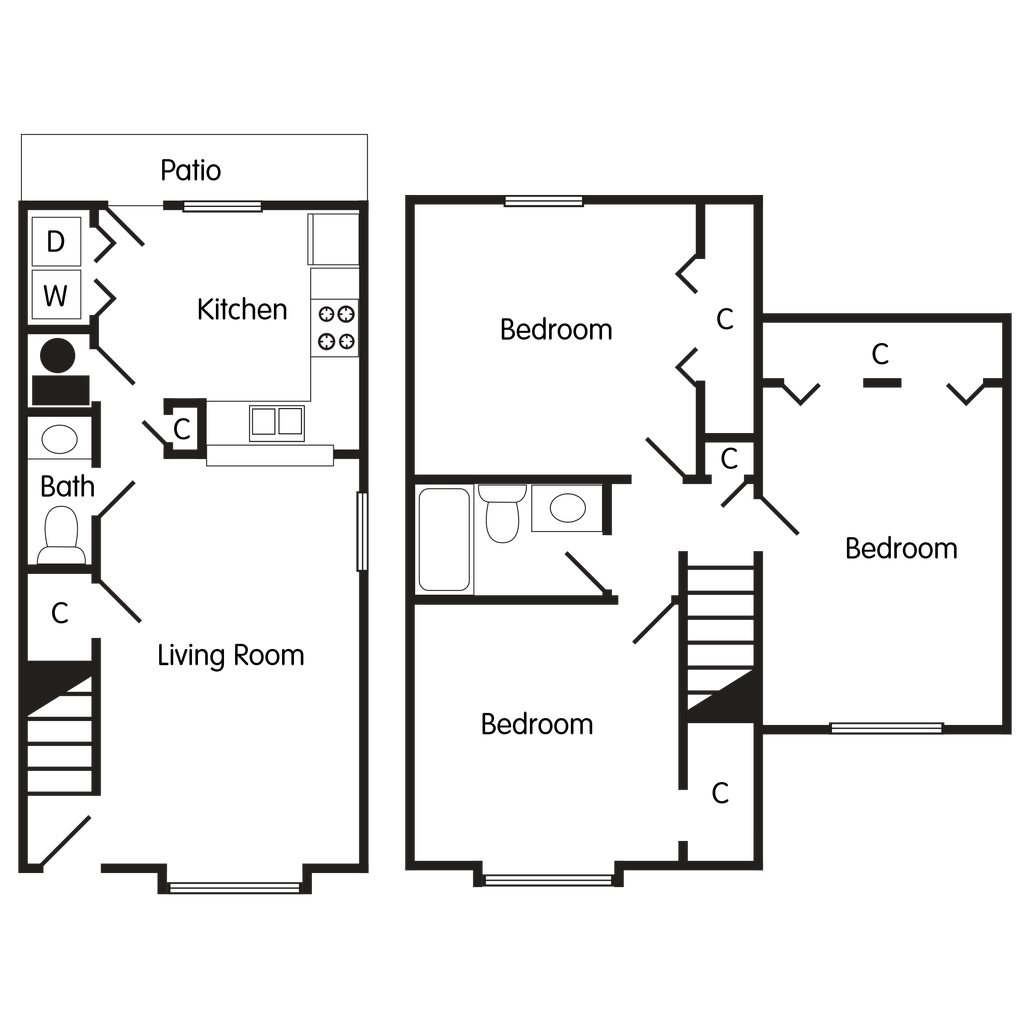 Apartment Model: Three Bedroom TownhomeCall For Rates3 Bedroom, 1.5 Bath, 1100 sq ftUnavailable![]()