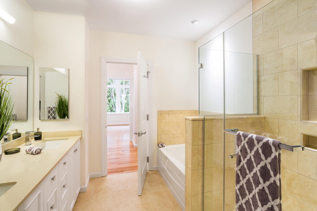 - Bathroom - Crema Marfil tile floors
