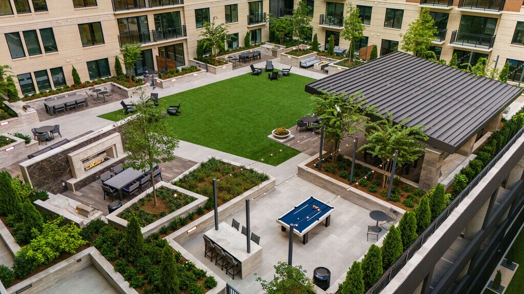 - Elevated open-air green space offering grills, fireplaces and cozy seating, surrounded by lush lands