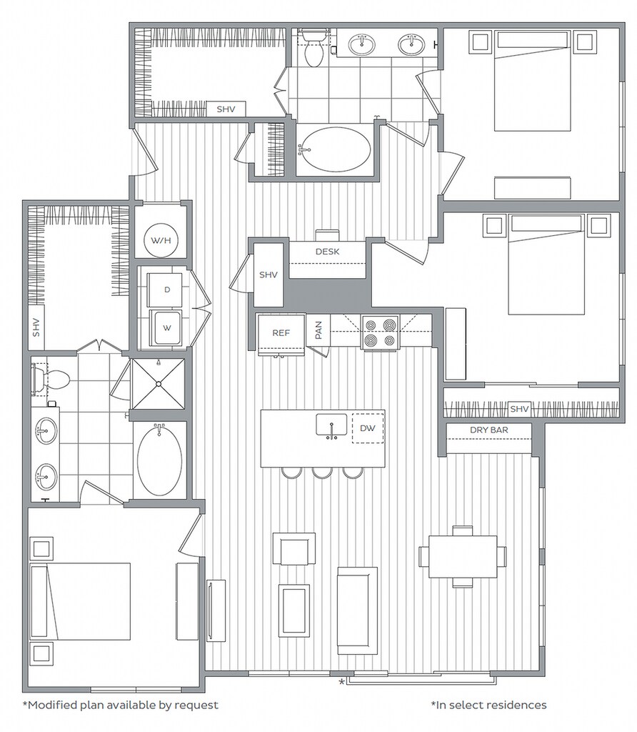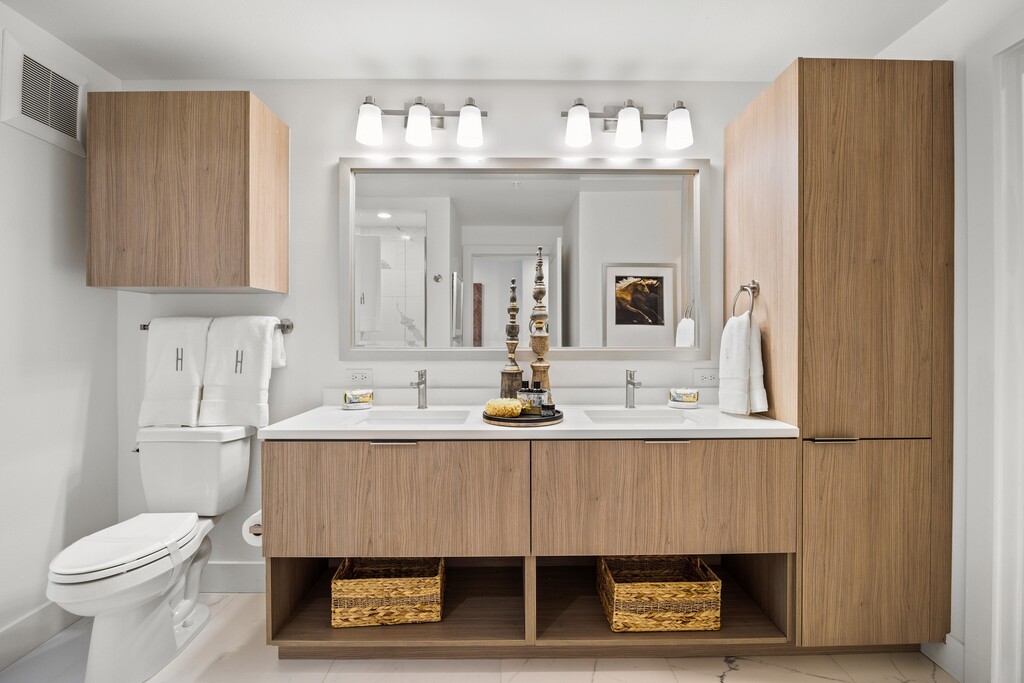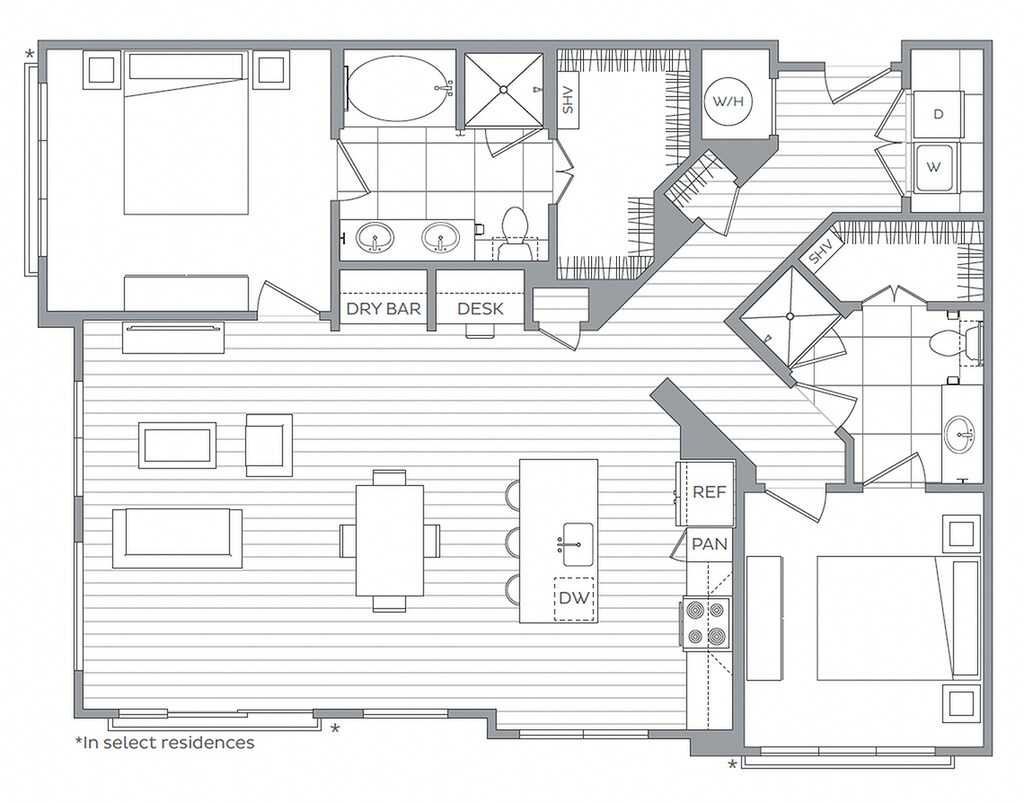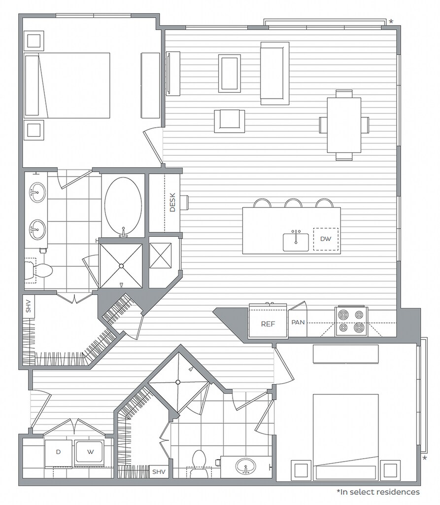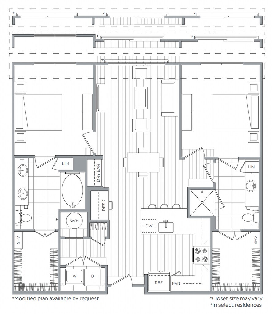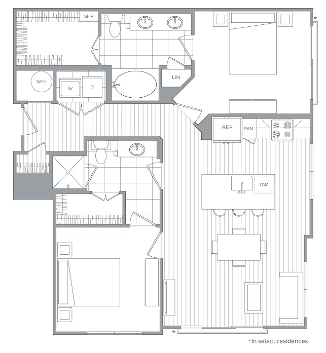 - Dual-vanity countertops, walk-in showers and linen closets*