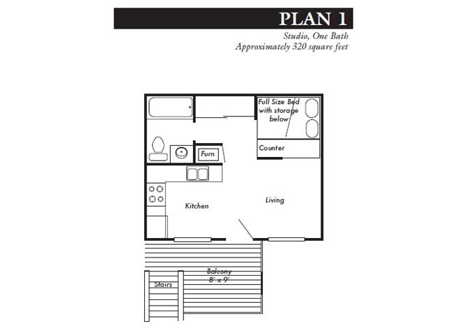 Apartment Model: Studio 1 Bath Plan 1Studio, 1 Bath, 320 sq ftUnavailable![]()