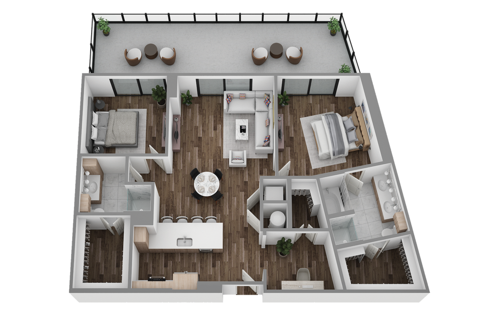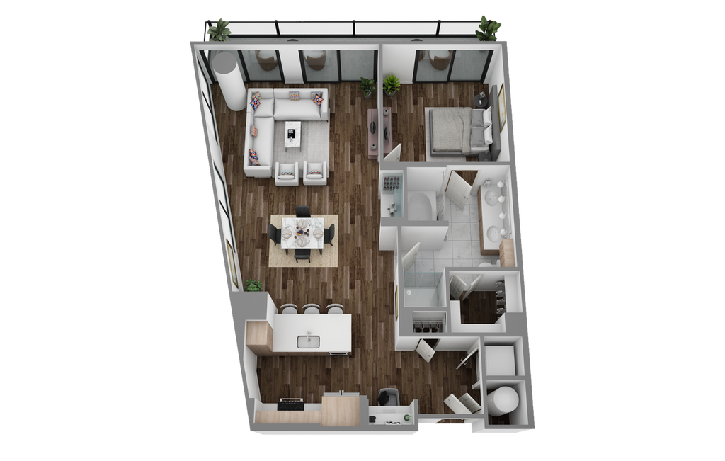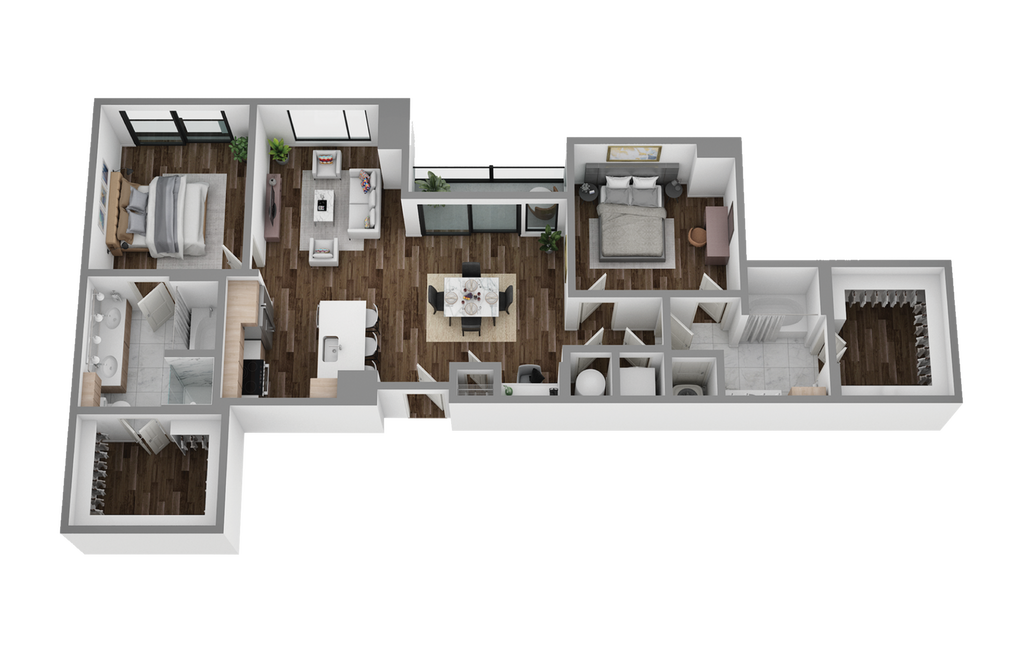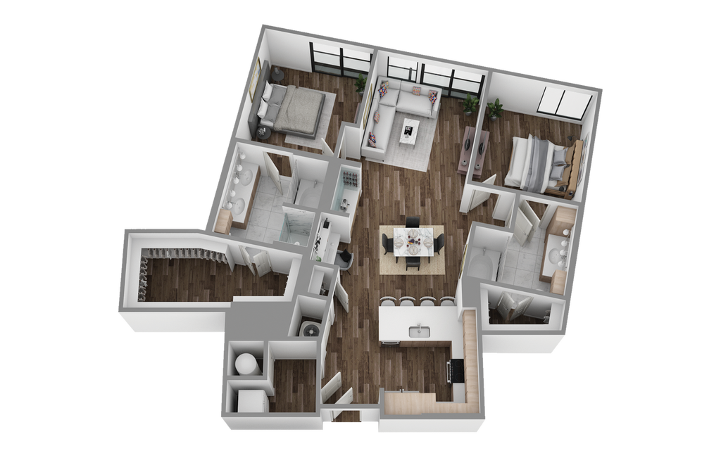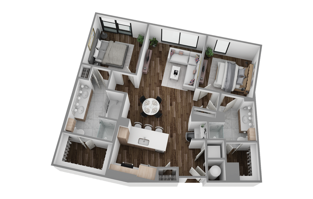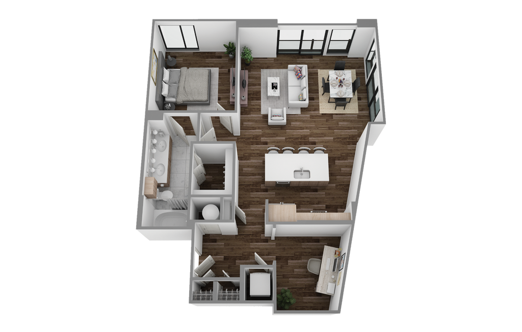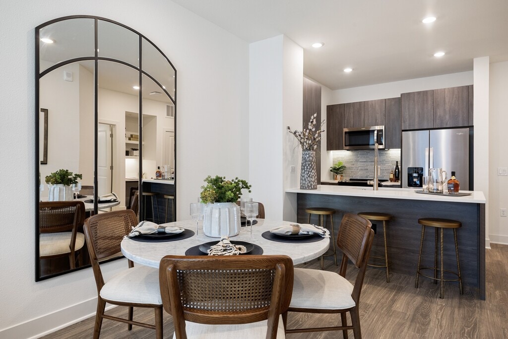 - Generous ceiling heights up to 16' and modern wide-plank wood-style flooring in elegant neutral tone