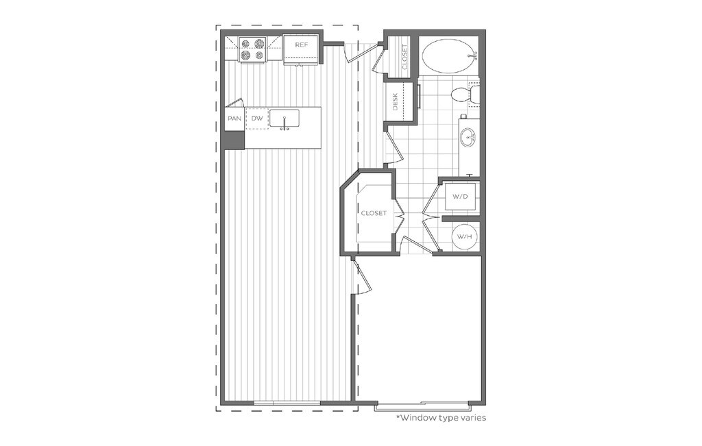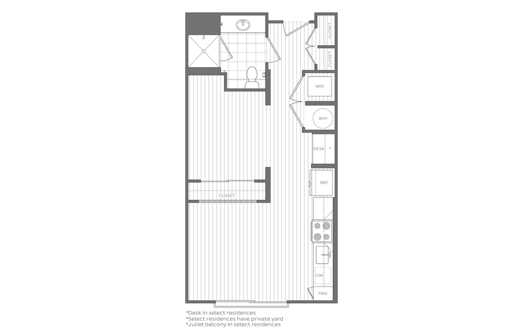 - StudioShow Unavailable Floorplans- Floorplan S1- From $1,358Studio, 1 Bath, 515-551 sq ftAvailable Nov 7- Model Gallery- Floorplans- Availability Details- Price - Availability Date - Unit - Sq Ft - Deposit - View Details - $1,430 - November 7, 2025 - 1-240 - 542 - $300 - $1,375 - December 4, 2025 - 1-403 - 543 - $300 - $1,447 - December 5, 2025 - 1-711 - 515 - $300 - Model Amenities and Features- Unique Features- Built-in desks and bookshelves, providing an essential work-from-home convenience*