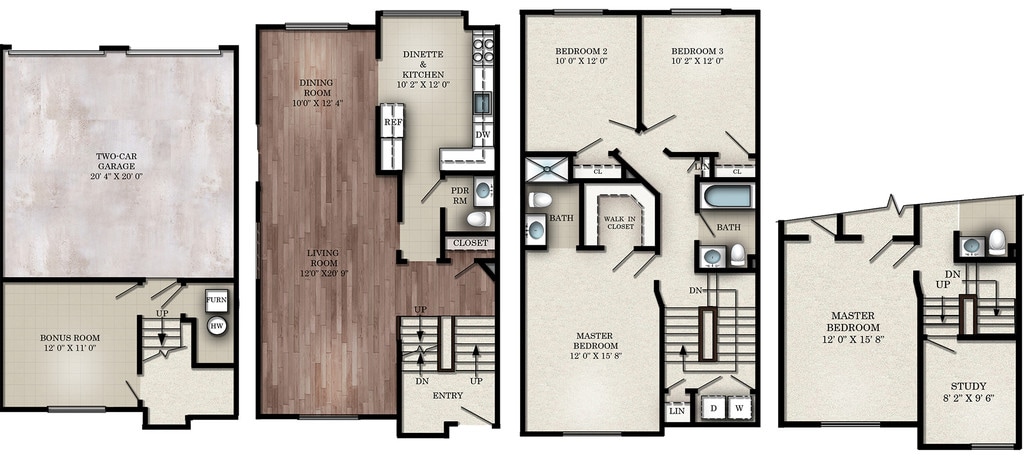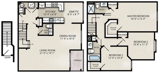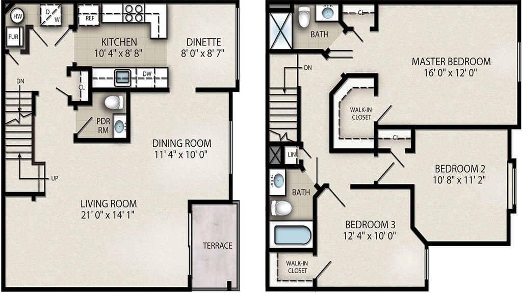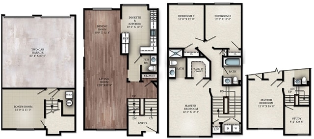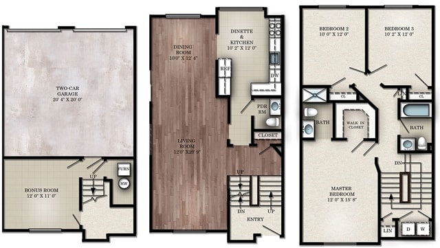 Apartment Model: 3 Bedroom Townhouse E$2,9153 Bedroom, 2.5 Bath, 1545-1550 sq ftAvailable Now![]()