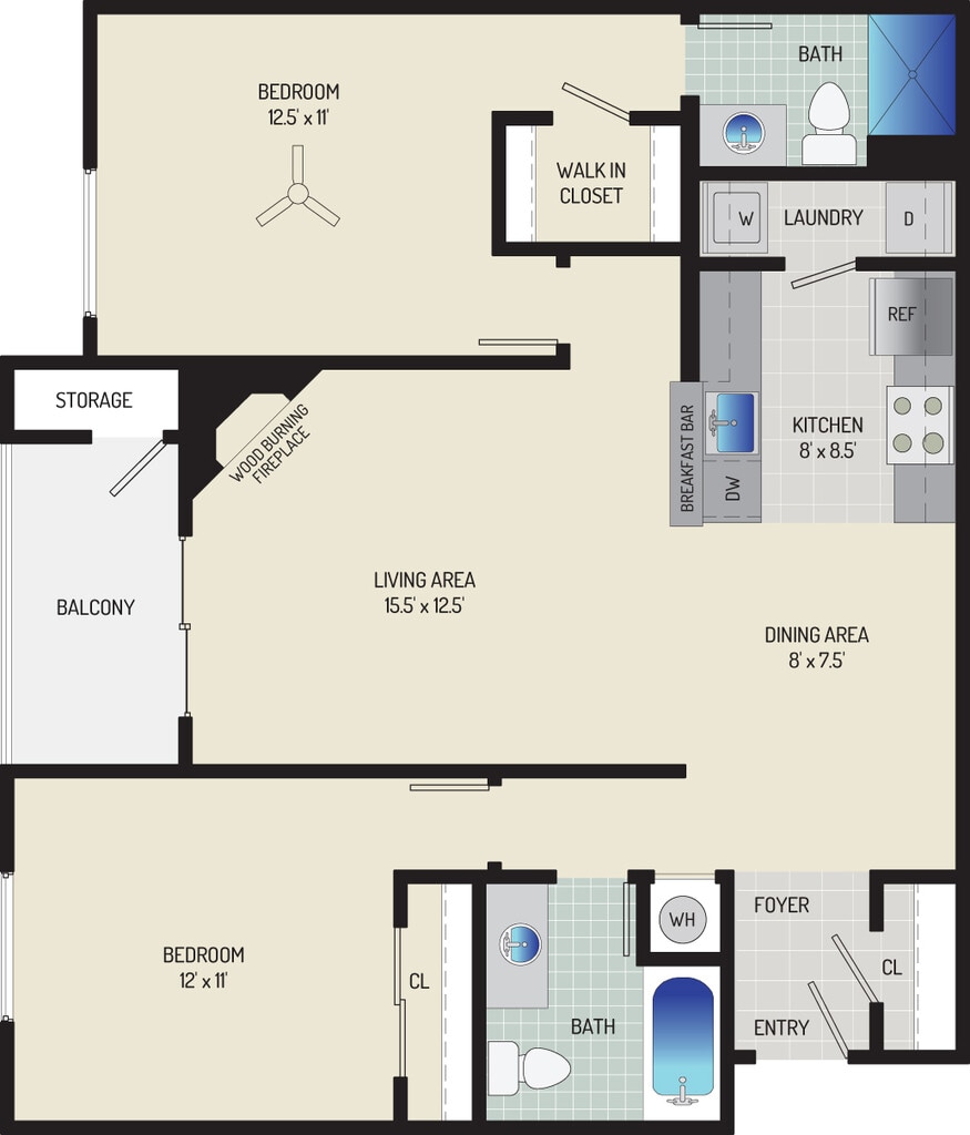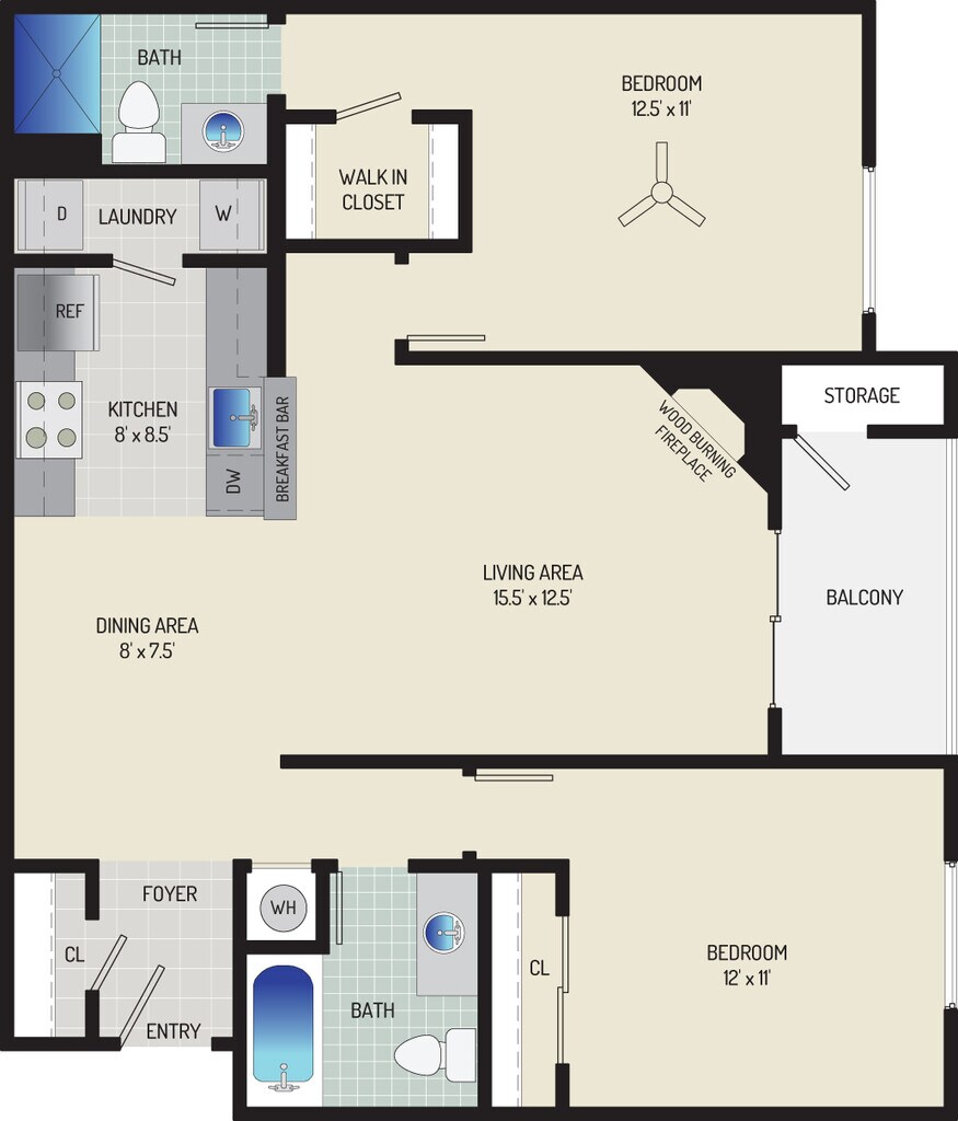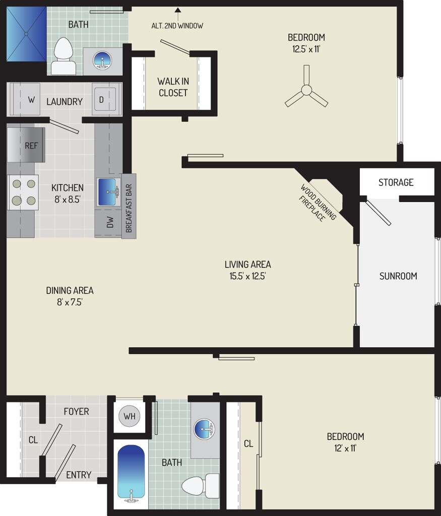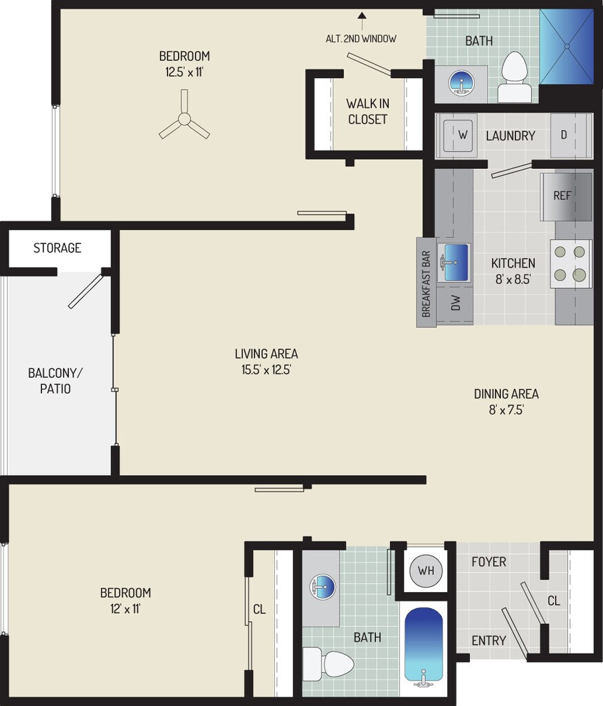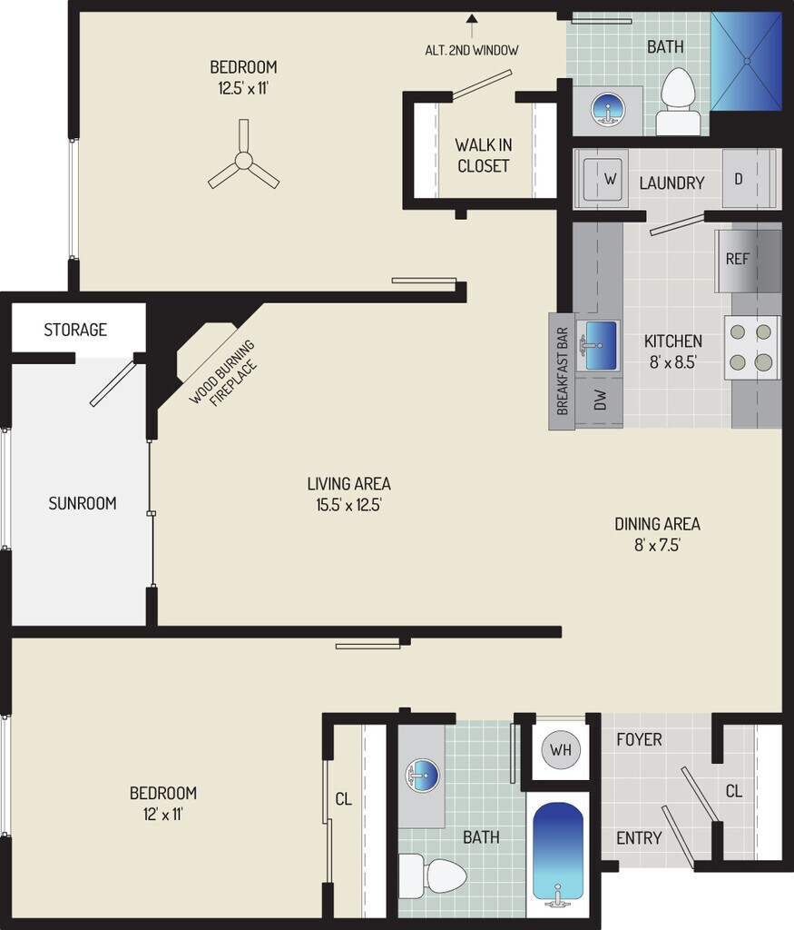 2 Bedrooms + 1 Bath - Floorplan 1 ![]()