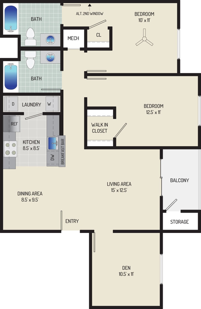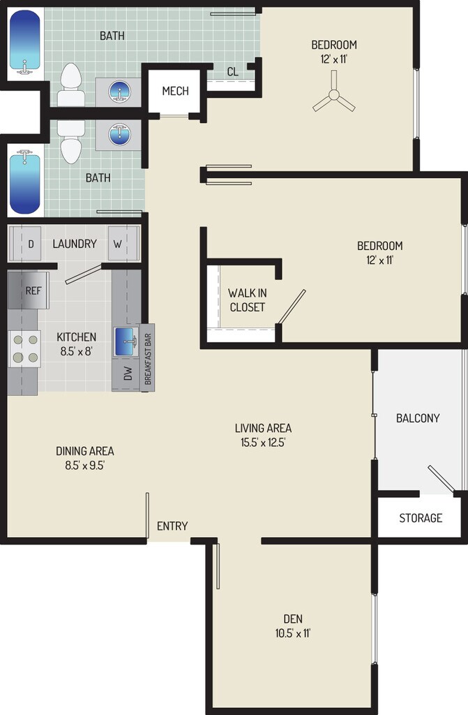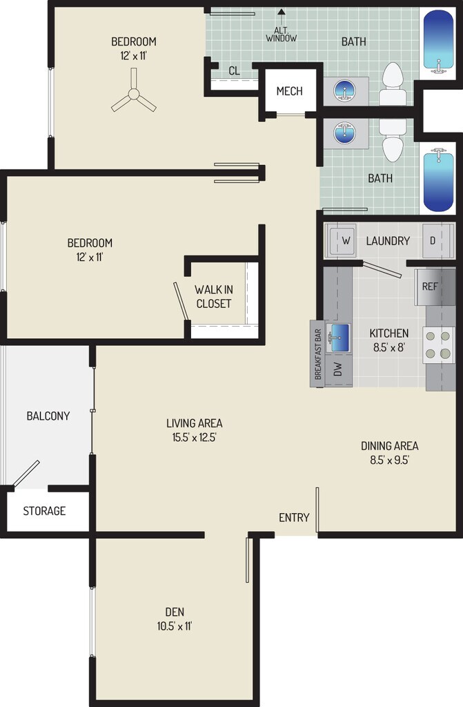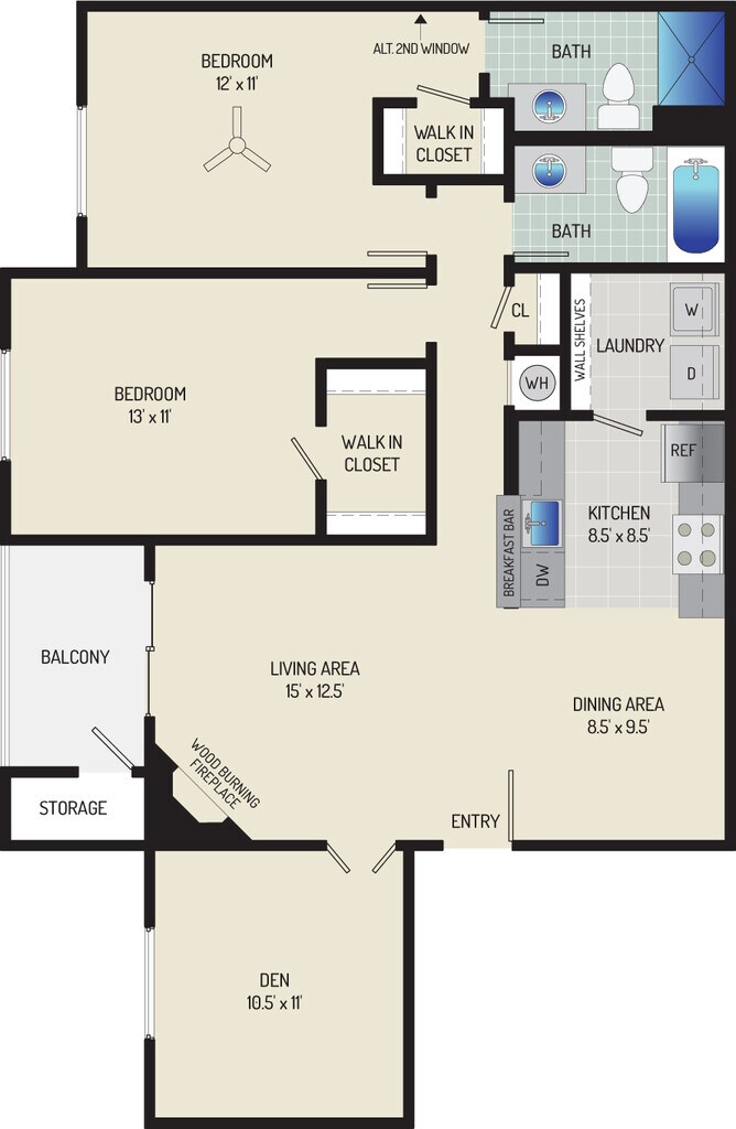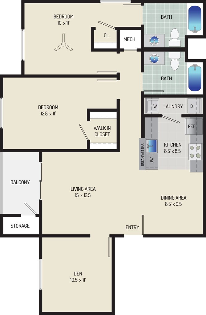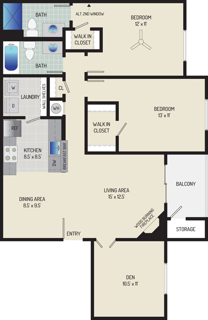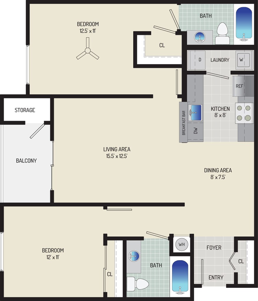 2 Bedrooms + 1 Bath - Floorplan 1 ![]()