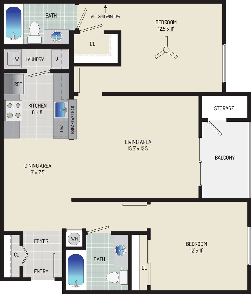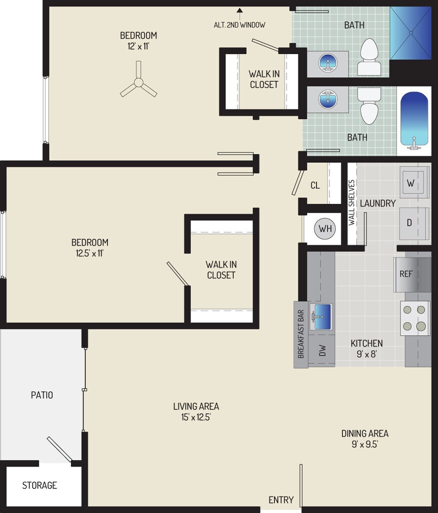 2 Bedrooms + 1 Bath - Floorplan 2 ![]()