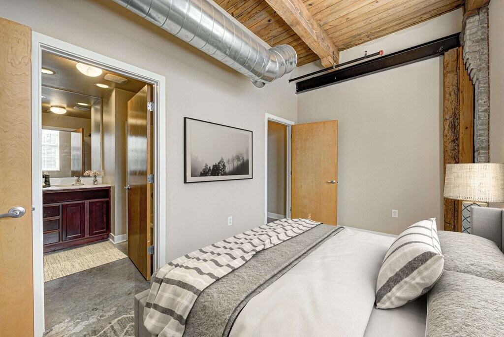 Beautiful floorplan, best use of space. This charming U Style is one of our smaller one bedrooms. Our architects left nothing to the imagination. This loft is facing downtown and overlooking our beautiful trees and has a historic door (non-operable) original to the building!