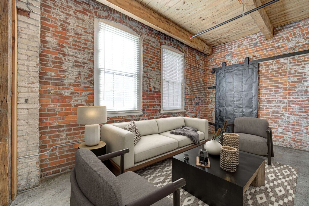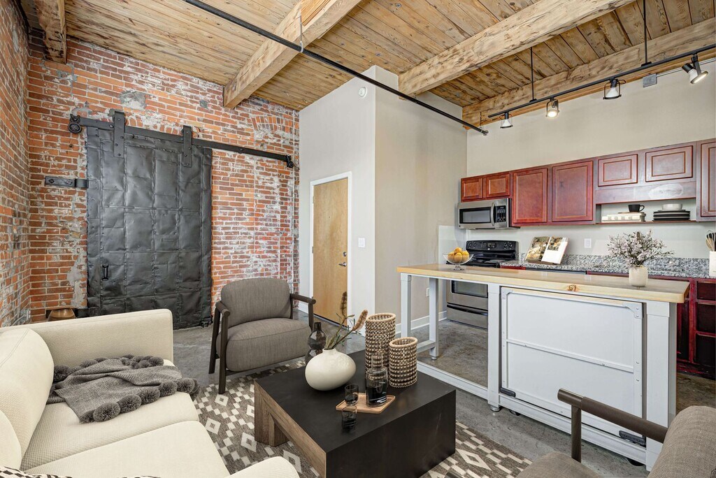 - 12' Original Wood Beam Ceilings Unique Loft-Style Living Spaces Open Layout/ Floor Plan Exposed Bric