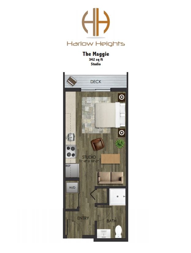The Maggie - Floorplan 6 Apartment Unit: 208Apartment Model: The Maggie$1,550Studio, 1 Bath, 342 sq ftAvailable NowThe Chelsea