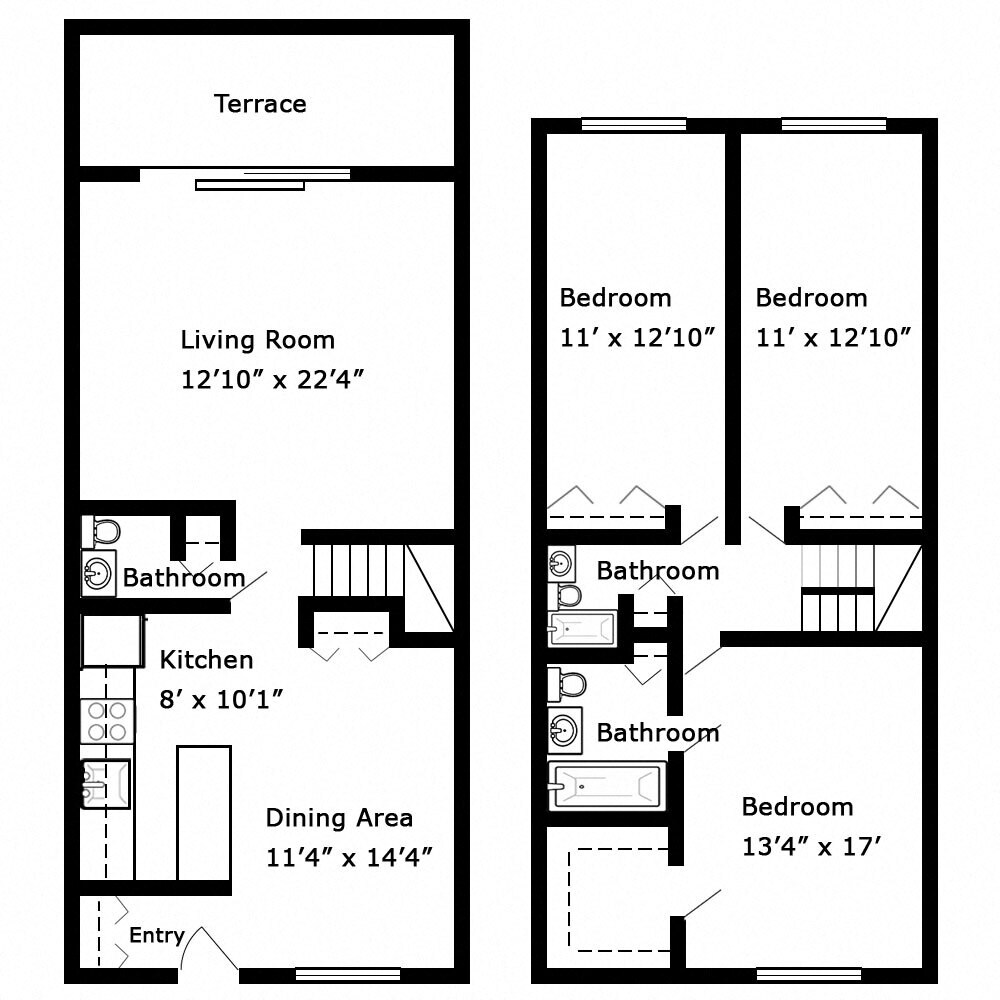 Apartment Model: 3 Bedroom - 2 Story3 Bedroom, 2.5 Bath, 1377 sq ftUnavailable3 Bedroom - 2 Story - Floorplan 1