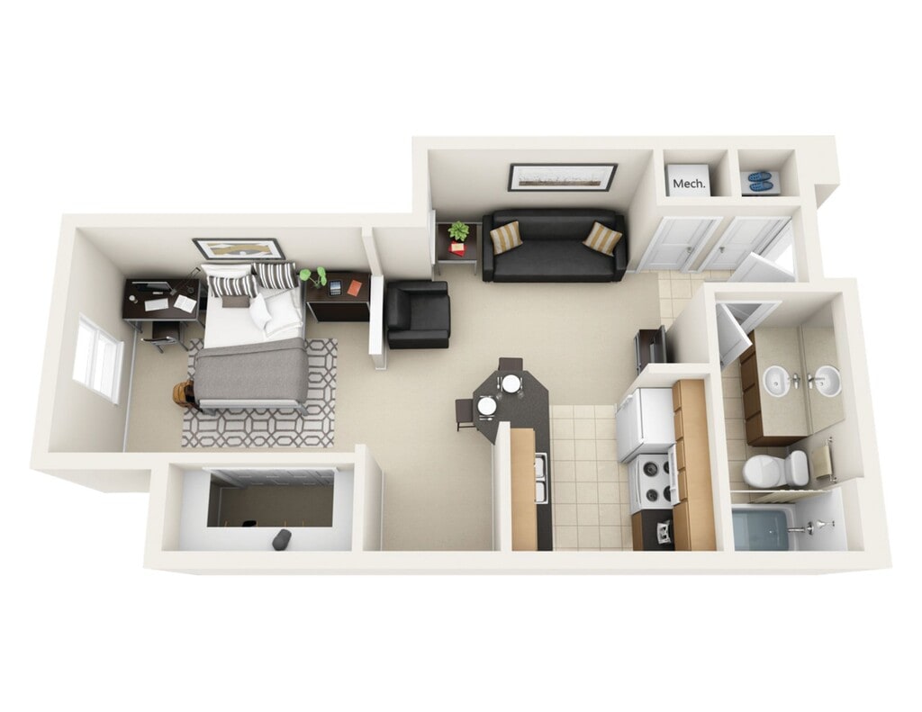 Apartment Model: Studio$1,263Studio, 1 Bath, 424 sq ftAvailable August 14, 2026![]()