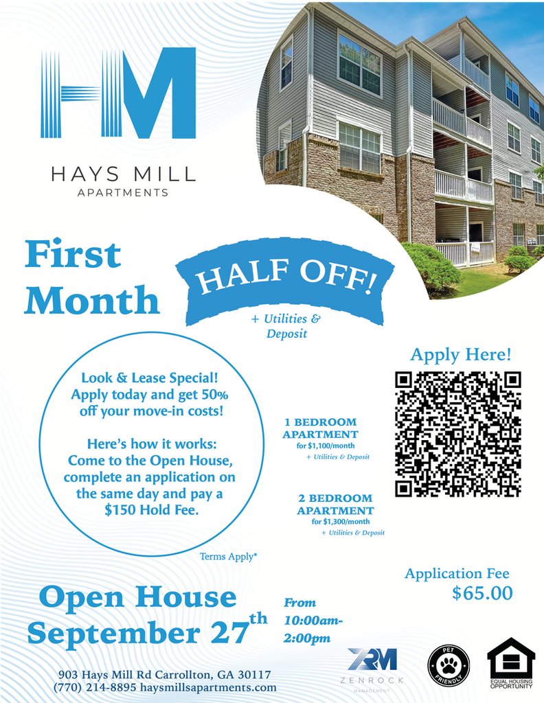 Hays Mill offers 1 Bedroom apartments starting from $1,100 and having 690 sq ft. Here is the current pricing and availability: