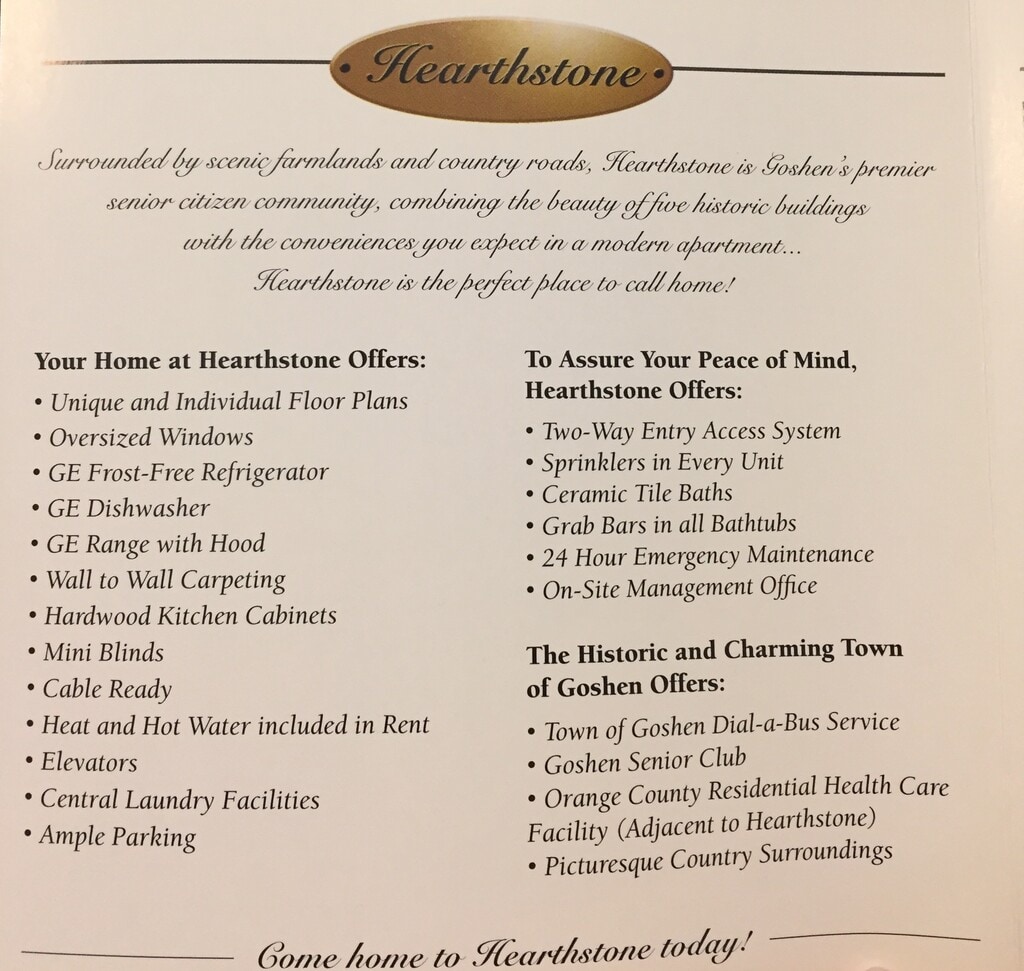 Hearthstone is surrounded by scenic farmlands and country roads. This property is Goshen’s premier affordable senior community. Hearthstone consists of 90 apartments and includes a Community Room and on-site laundry facility in a beautiful restoration of historic buildings. Hearthstone is a non-smoking facility.