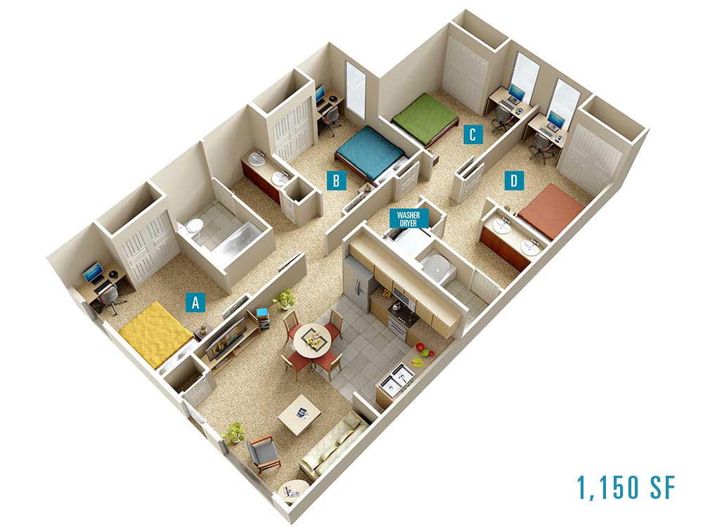 Apartment Unit: Full 4 Bedroom apartmentApartment Model: D3$1,9004 Bedroom, 2 Bath, 287-288 sq ftAvailable NowApartment Unit: PrivateApartment Model: D3$4754 Bedroom, 2 Bath, 287-288 sq ftAvailable NowApartment Unit: Two rooms in Four BedroomApartment Model: D3$9504 Bedroom, 2 Bath, 287-288 sq ftAvailable NowFloorplan D1