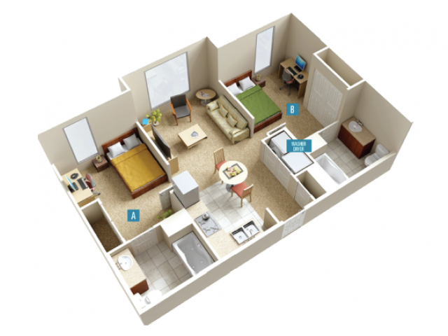 4 Beds, 2 Baths, 287-288 sq ftAvailable NowModel Gallery