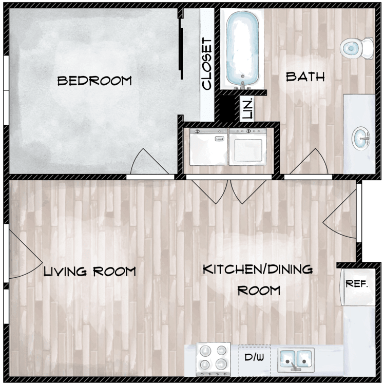1 Bed, 1 Bath, 542-544 sq ftAvailable NowModel Gallery