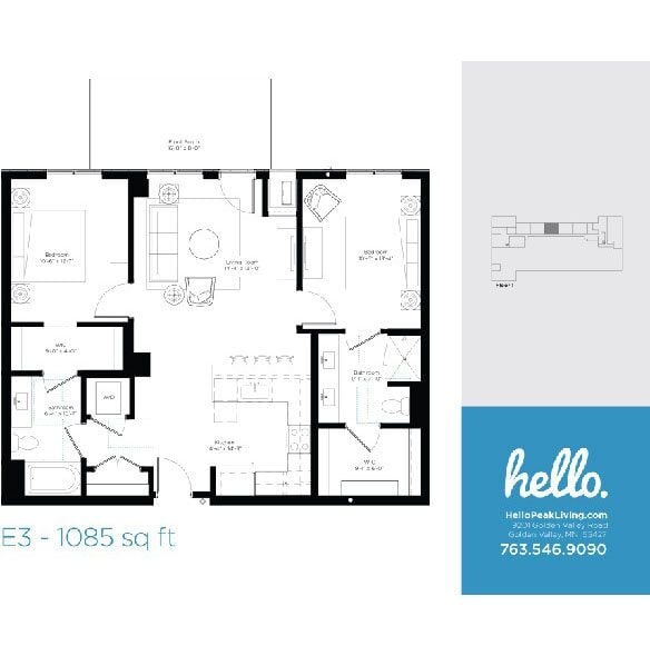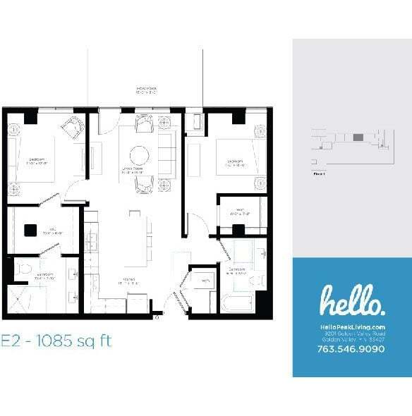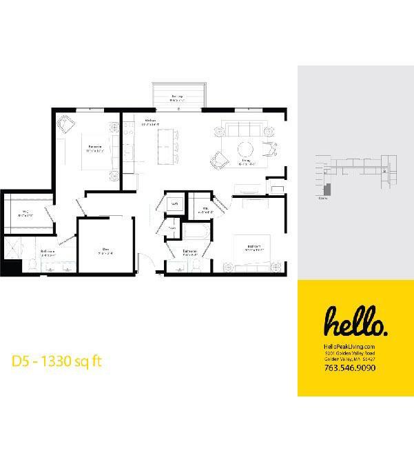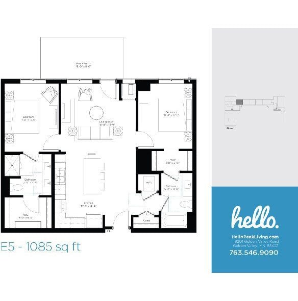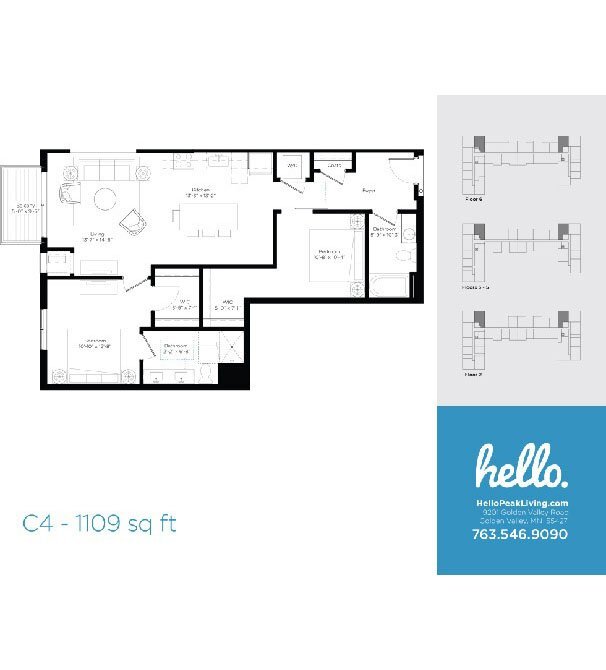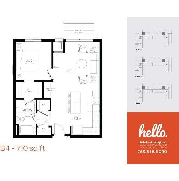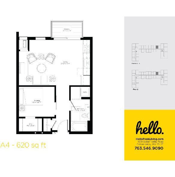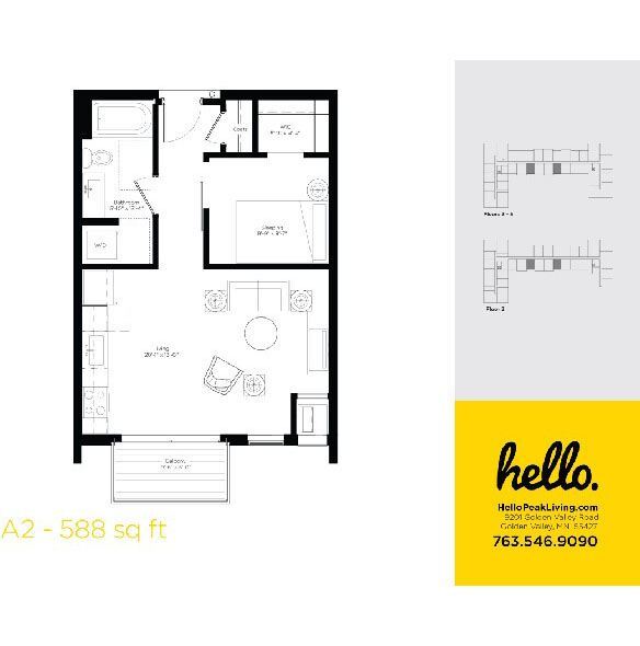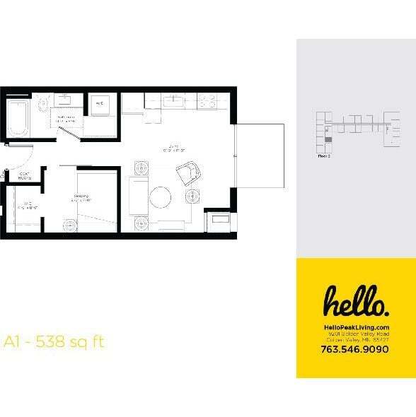 Offering well-designed one- and two-bedroom apartment homes with remarkable interior features such as polished quartz countertops and luxury vinyl plank flooring, and expansive walk-in closets- schedule an appointment to come say HELLO to your new home. At Hello, you'll enjoy access to the city, unmatched urban amenities, and all the beauty of Golden Valley. Enjoy an activity-filled weekend indoors or out. Hello Apartments features a lobby bar and second-floor clubroom with games, comfortable seating as well as a full kitchen for private get-togethers or resident events such as cooking demos and holiday celebrations.Hello is proudly managed by Peak Living. At Peak Living, our mission is to lead the property management industry by creating communities where our residents love to live and our employees love to work. Please visit for more information.
