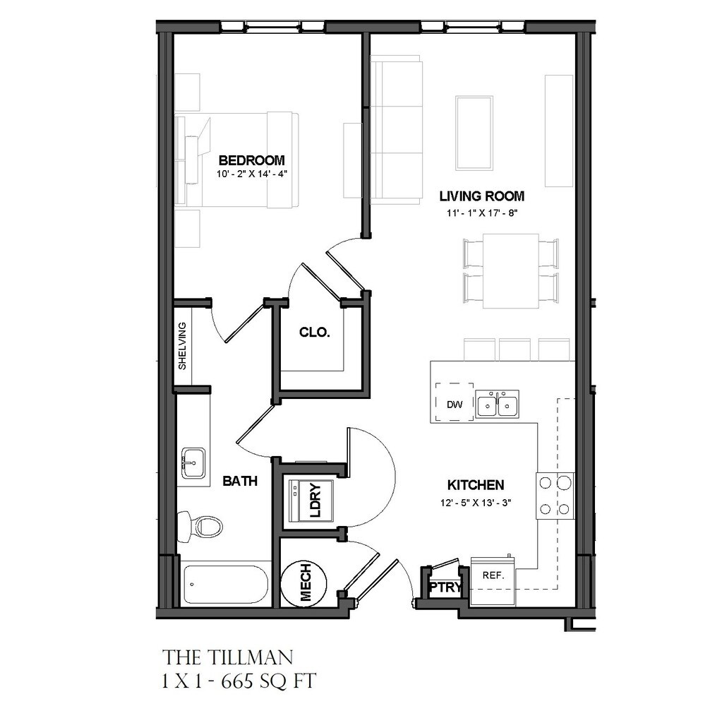 Apartment Model: The Tilman$1,6501 Bedroom, 1 Bath, 665 sq ftAvailable NowFloorplansPhotos![]()