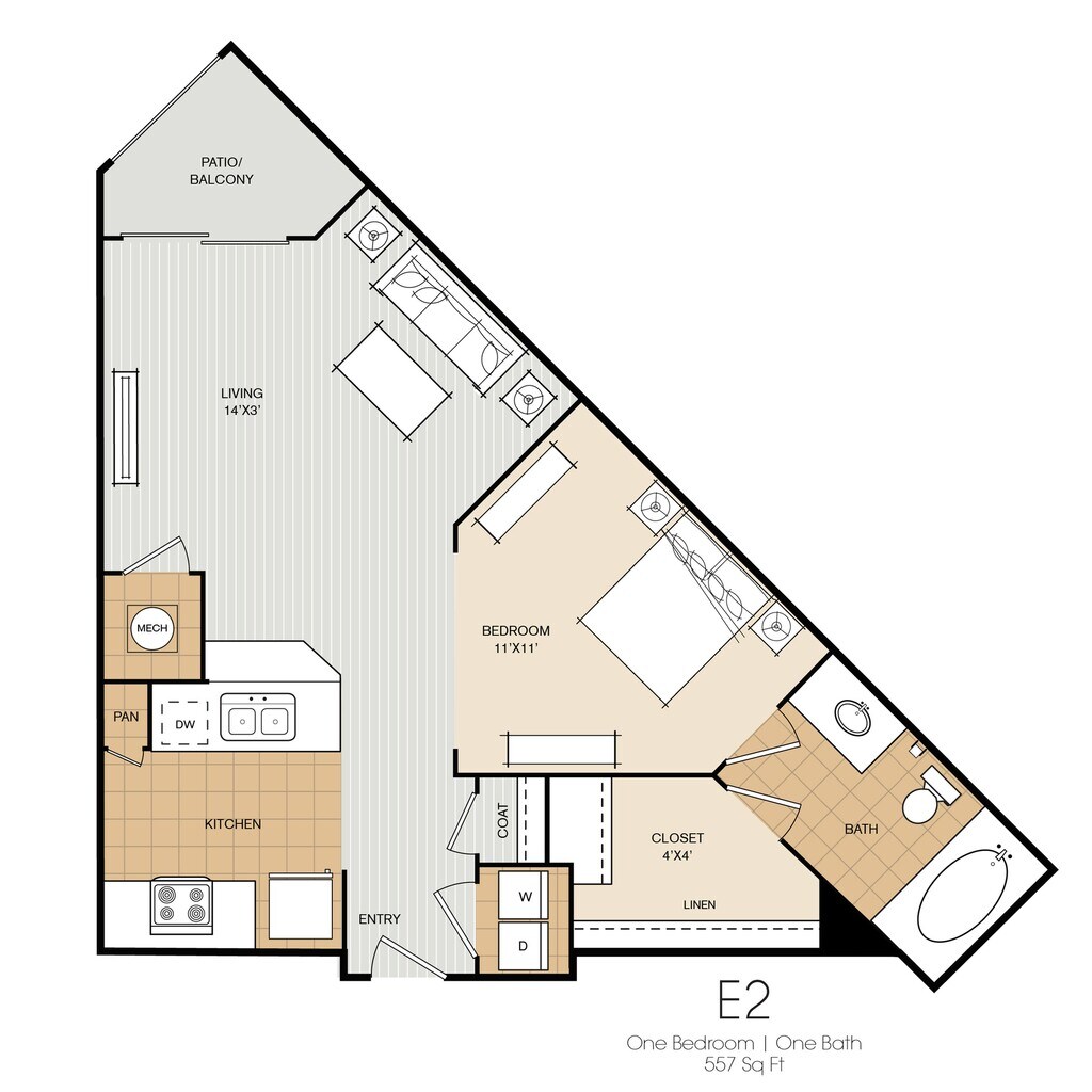 e10e - Floorplan 1 Apartment Unit: 156Apartment Model: e10eCall For RatesStudio, 1 Bath, 736 sq ftAvailable Now1 Bedroom