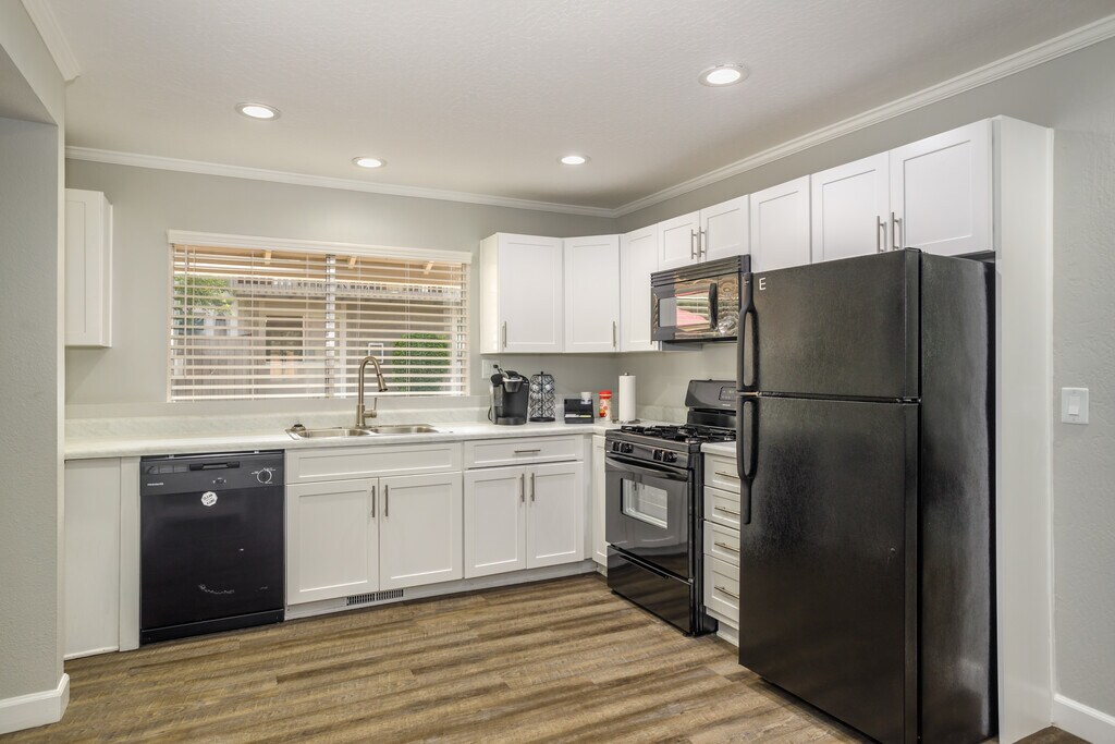 Newly renovated unit with white shaker cabinets new sinks, new fixtures, white appliances ( gas for cooking), beautiful patio and washer dryer in unit.
