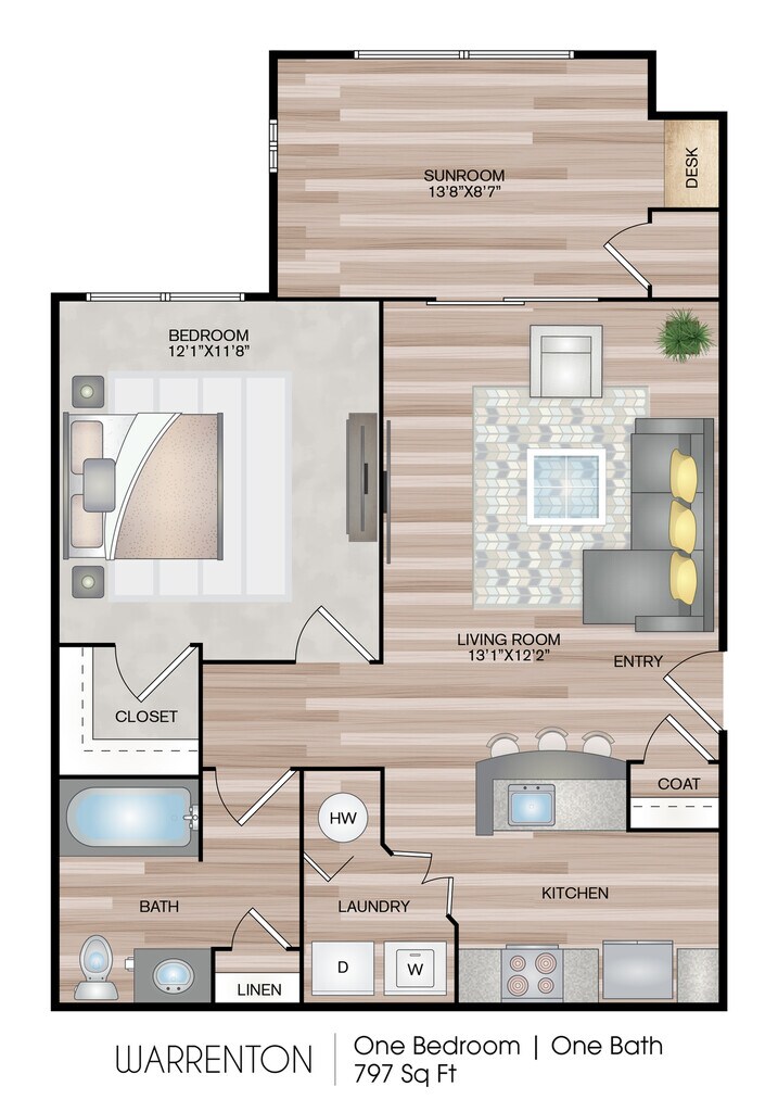 Apartment Model: WarrentonFrom $1,5551 Bedroom, 1 Bath, 797 sq ftAvailable November 14, 2025![]()