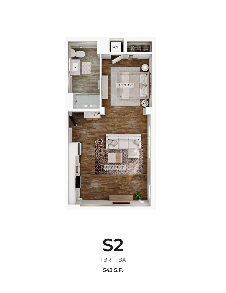 S2 - Floorplan 1 Apartment Unit: 330Apartment Model: S2$2,592Studio, 1 Bath, 543 sq ftAvailable January 6, 2026Floorplan S4