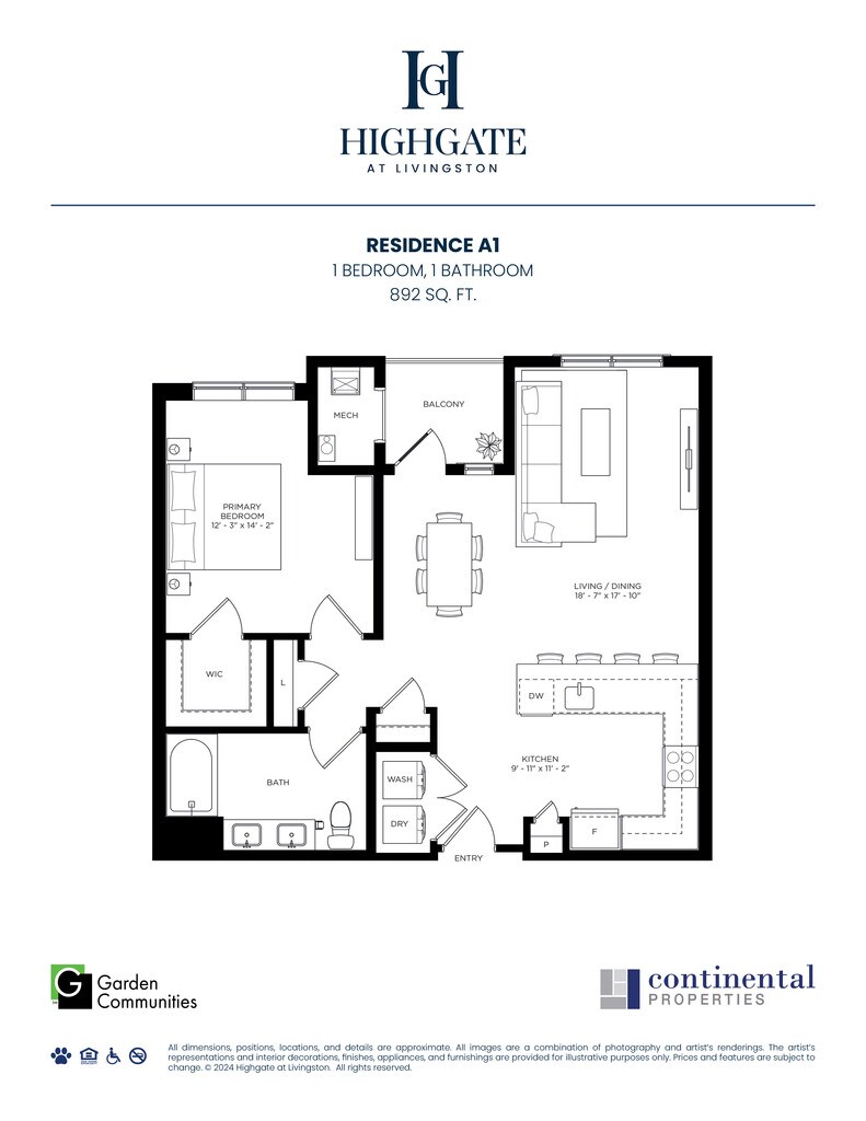 Apartment Model: $3.39/sq.ft. - Residence A1From $3,0251 Bedroom, 1 Bath, 892 sq ftUnavailable![]()